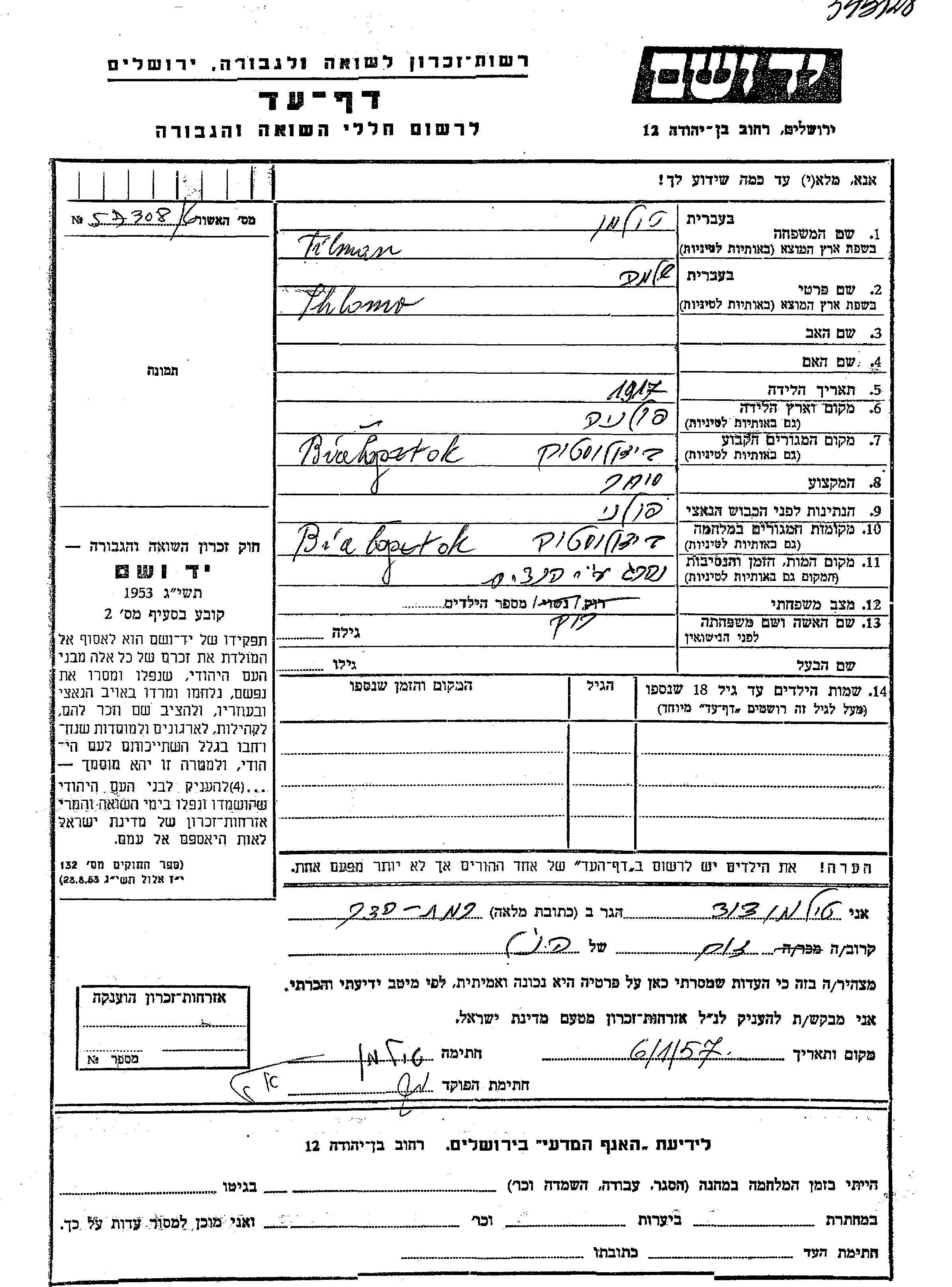 Тильман Шломо 1917 Белосток, Польша Лист свидетельских показаний