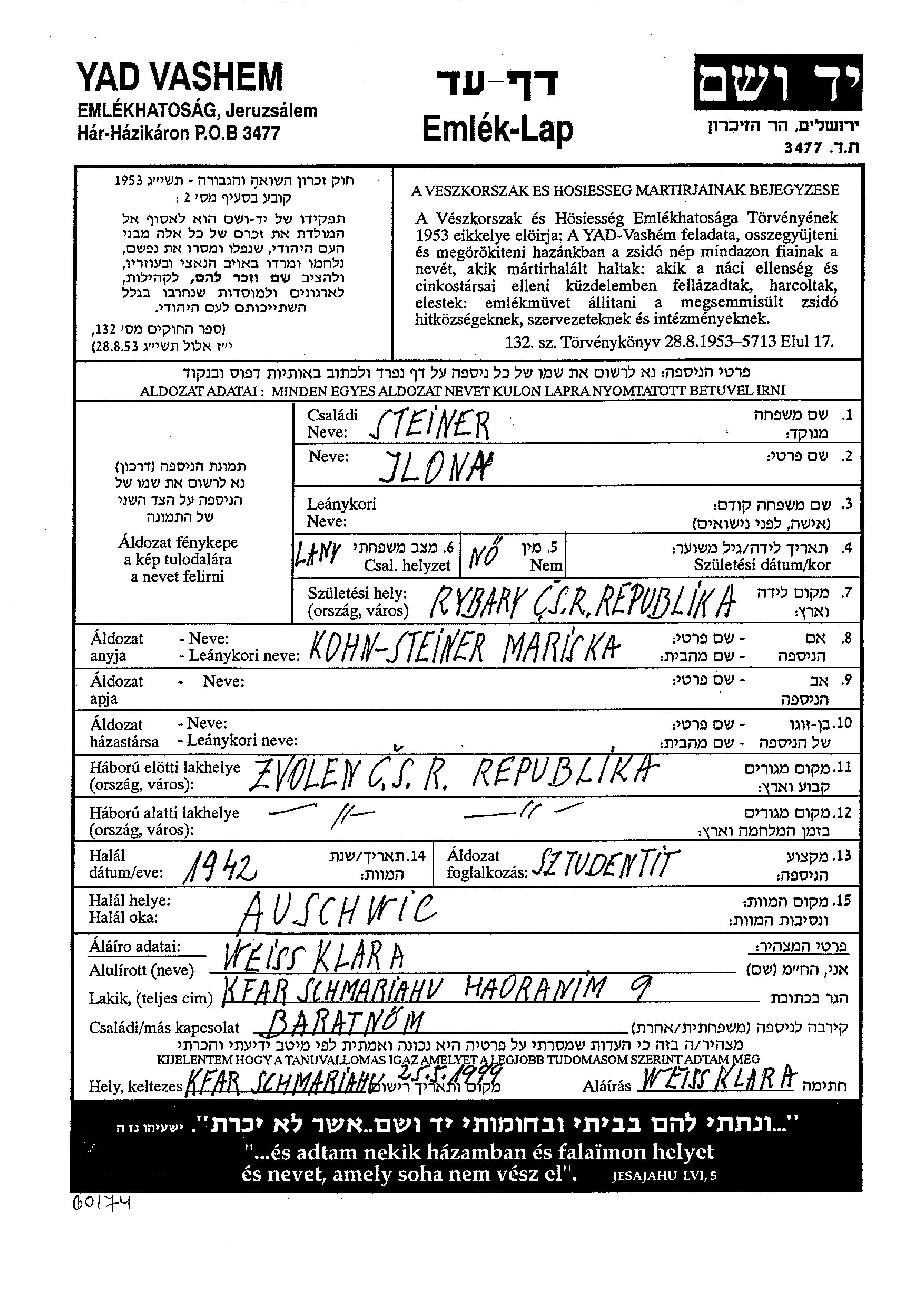 Илона Штайнер, место рождения: Рыбары, Чехословакия.Mать:Мариска. Студент / студентка. Ребенок. Место жительства до войны: Зволен, Чехословакия. Место во время войны: Зволен, Чехословакия.