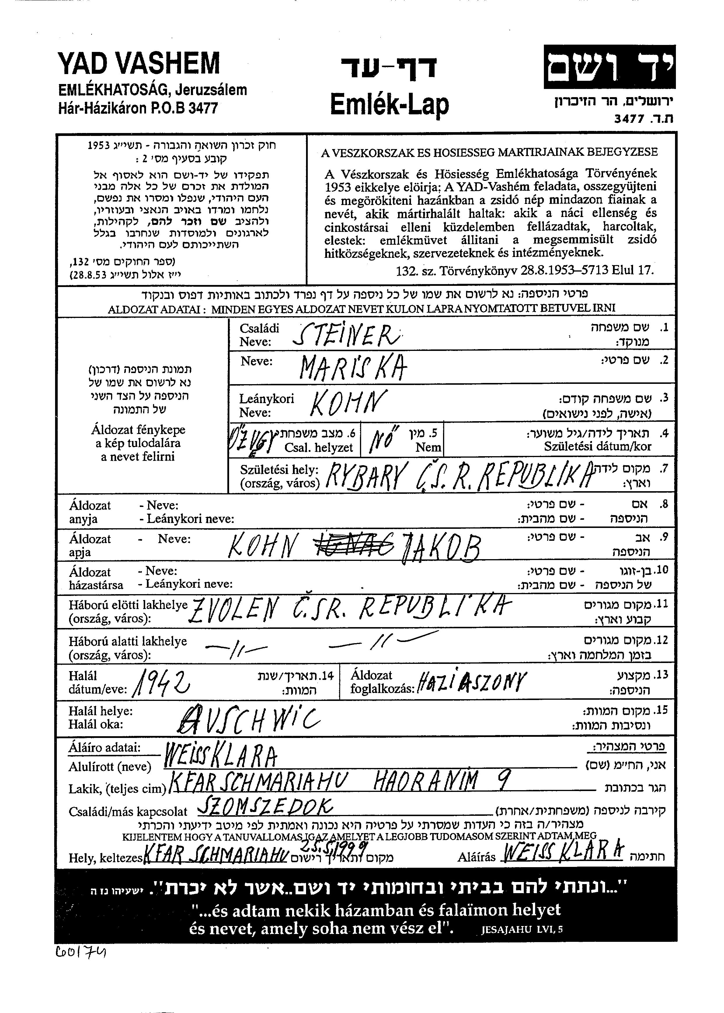 Мариска Штайнер, девичья фамилия Кон, место рождения: Рыбары, Чехословакия. Отец: Якоб. Домохозяйка. Вдовец / вдова. Место жительства до войны: Зволен, Чехословакия. Место во время войны: Зволен, Чехословакия.