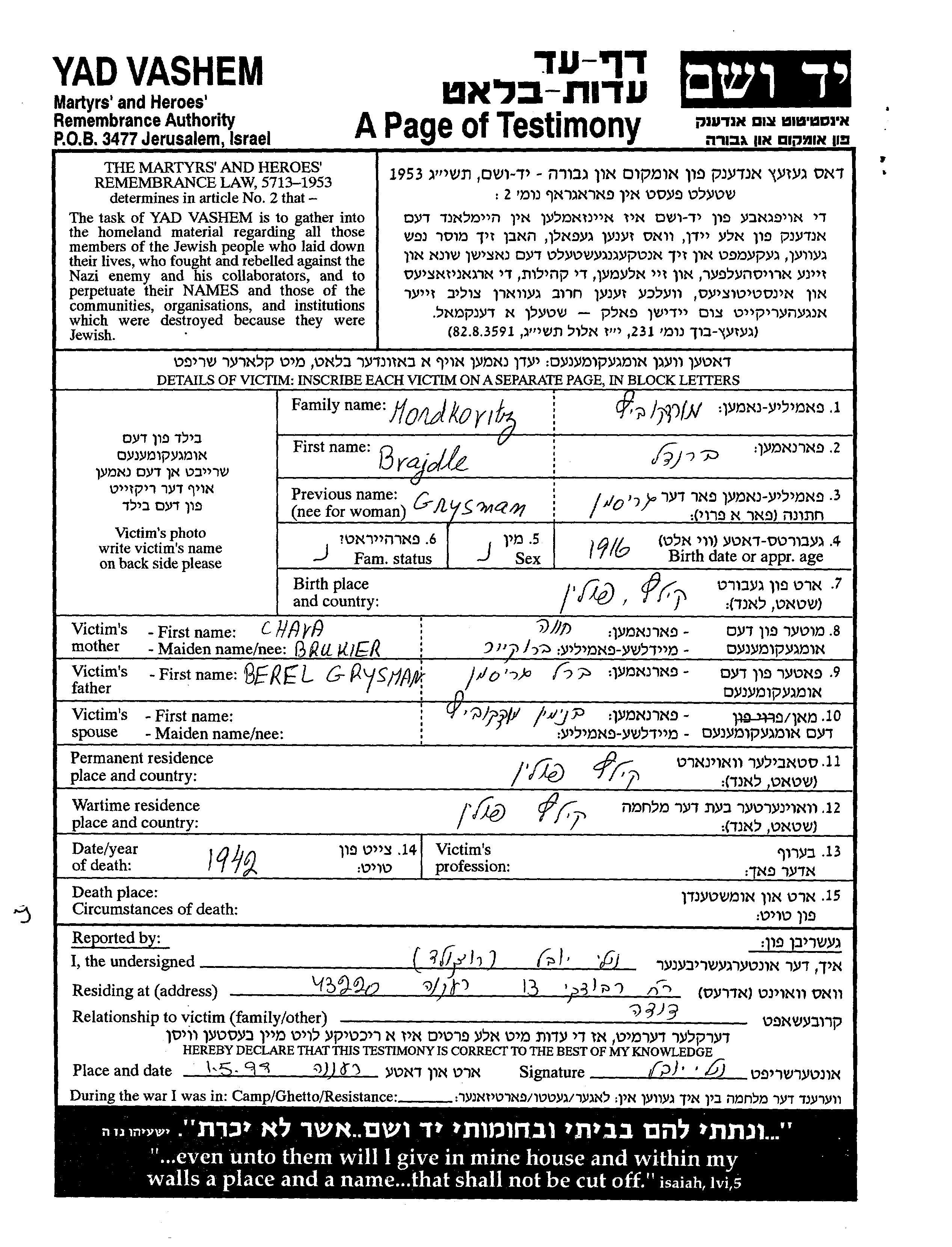 Брейна Мордковиц, девичья фамилия Грисман, место рождения: Кельце, Польша. Отец: Берл, mать:Хава. Женат / замужем. Место жительства до войны: Кельце, Польша. Место во время войны: Кельце, Польша.