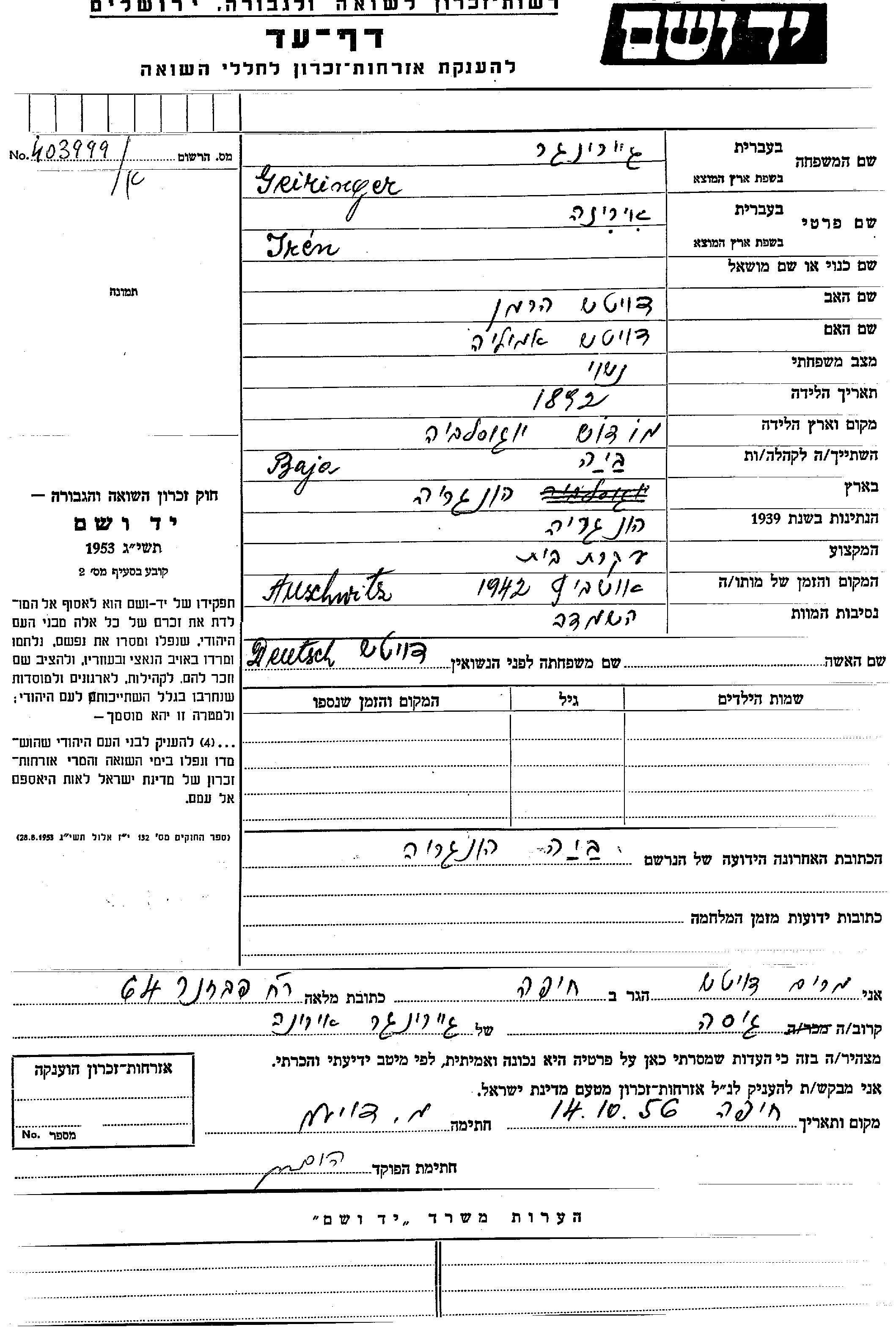 Ирен Гейрингер, девичья фамилия Дойч, место рождения: Модош, Югославия. Отец: Херман, mать:Эмилия. Домохозяйка. Женат / замужем. Место жительства до войны: Байа, Венгрия.