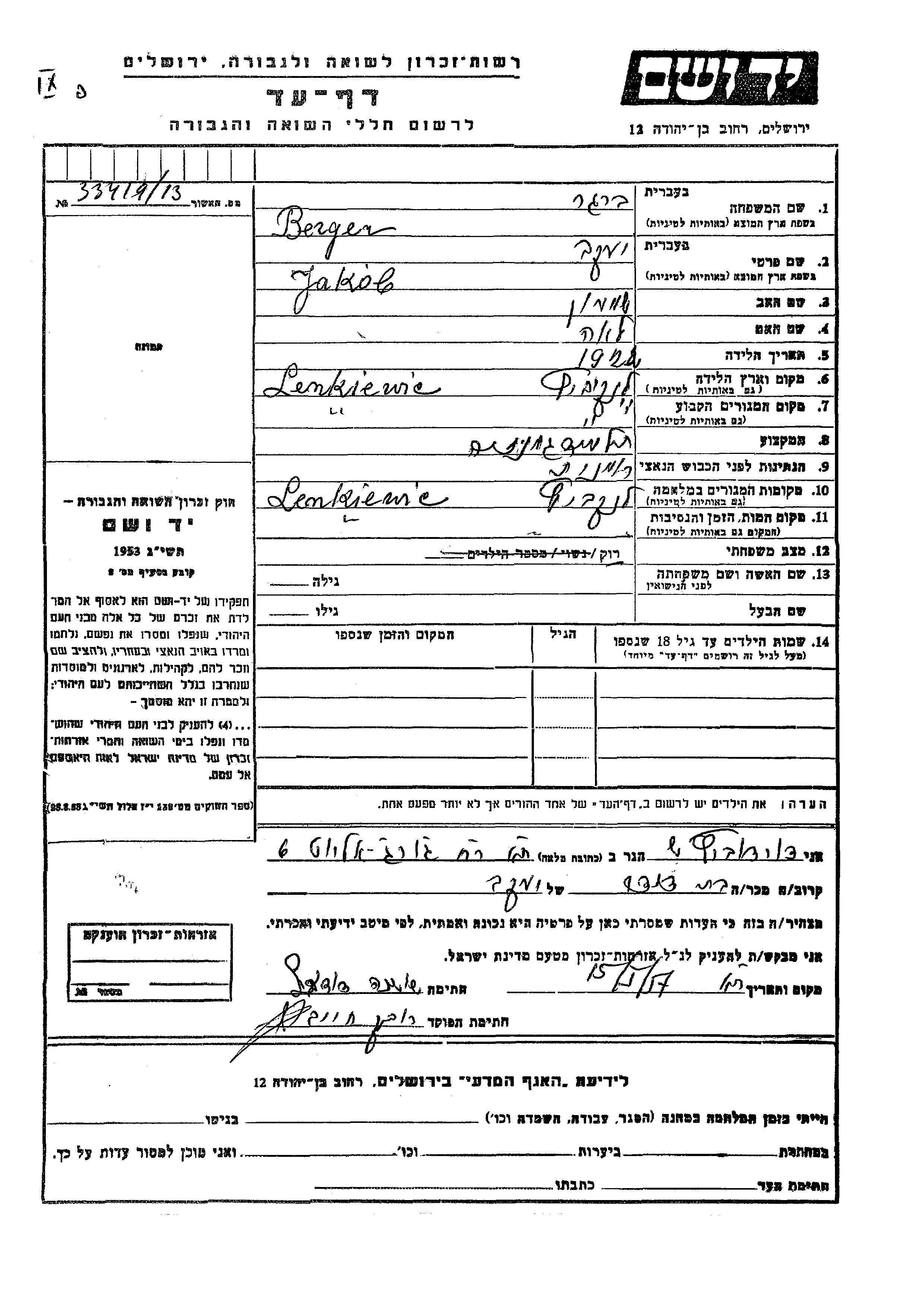 Якоб Бергер, место рождения: Ленковиц, Румыния. Отец: Шимон, mать:Лея. Ученик средней школы. Холост / не замужем. Место жительства до войны: Ленковиц, Румыния. Место во время войны: Ленковиц, Румыния.
