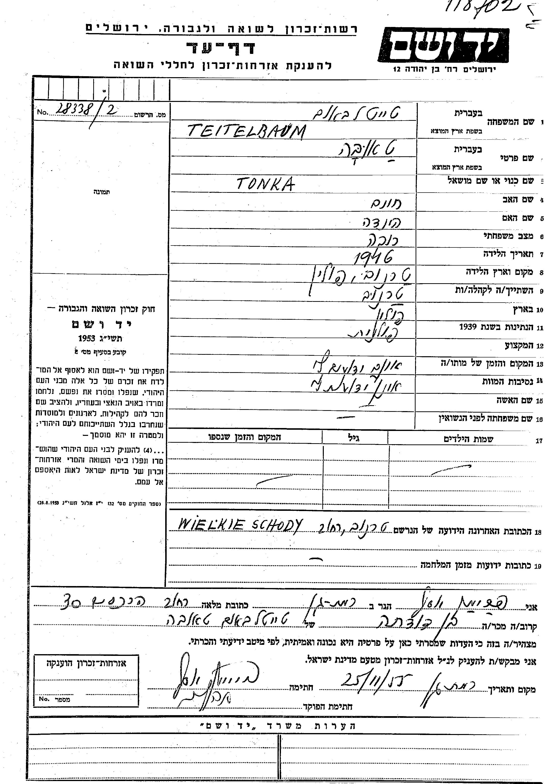 Тонка Тауба Тейтельбаум, место рождения: Тарнув, Польша. Отец: Хаим, mать:Хинда. Холост / не замужем. Место жительства до войны: Тарнув, Польша.
