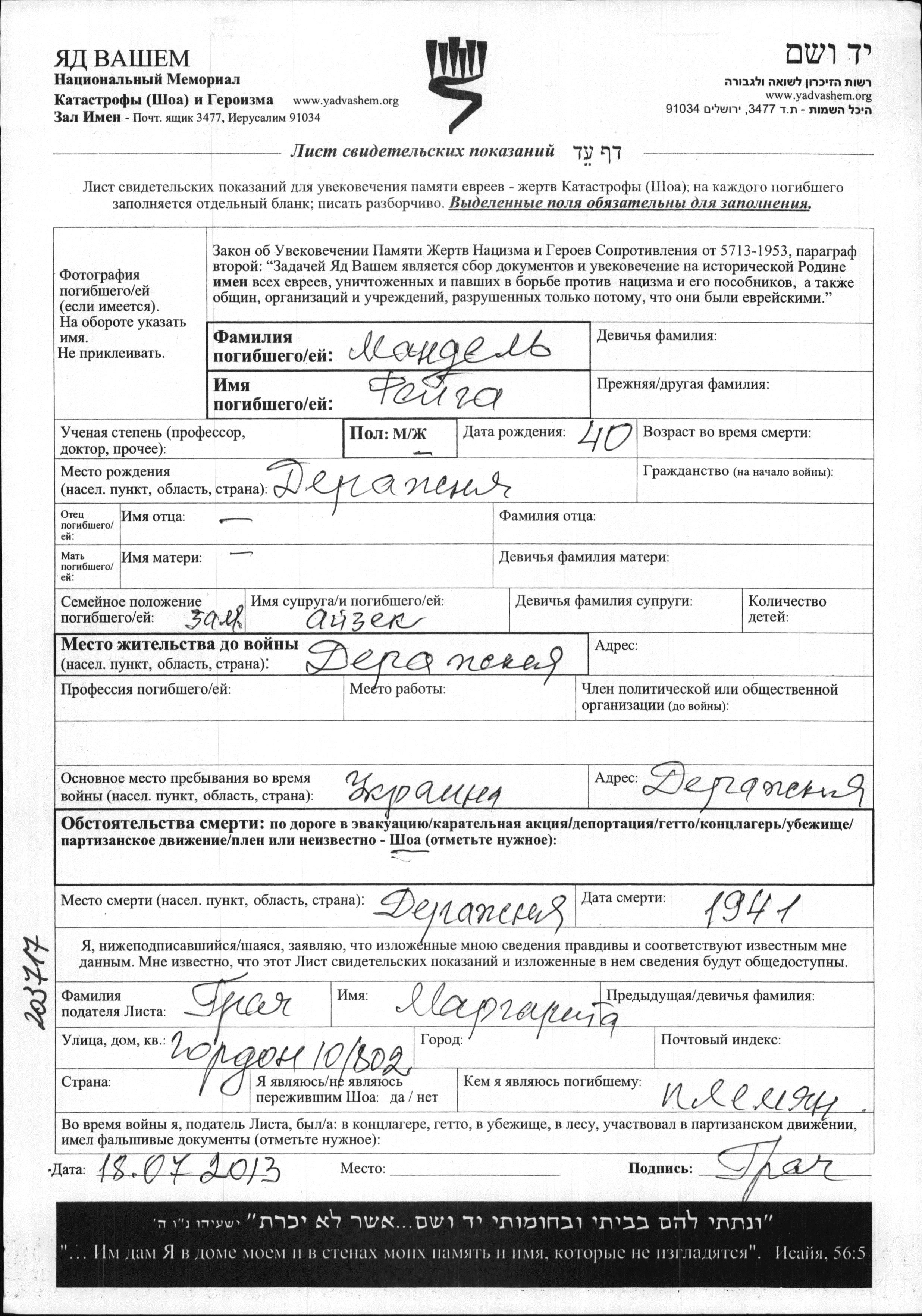 Мандель Фейга Деражня, Украина (СССР) Лист свидетельских показаний