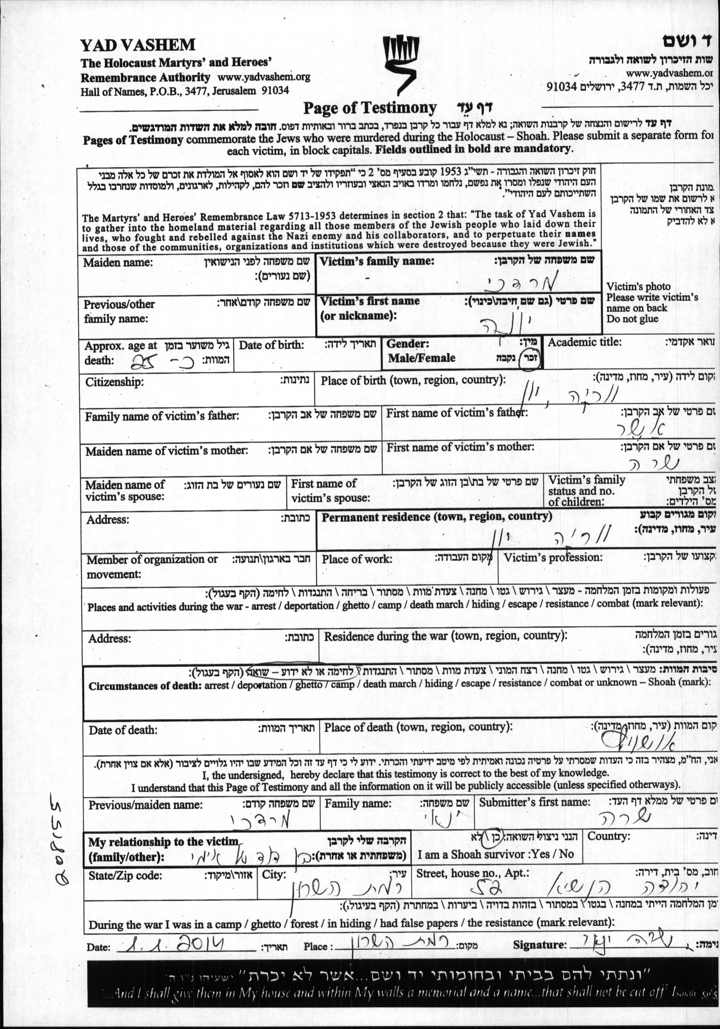 Яд Вашем - Листы свидетельских показаний Мемориального фонда
