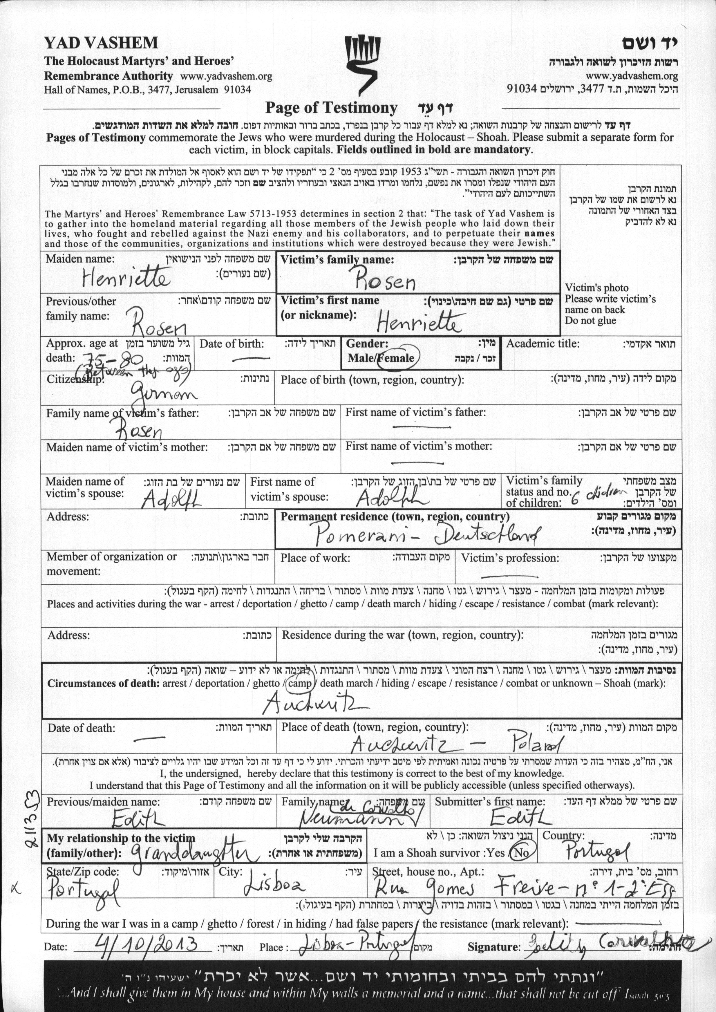 Хенриетте Розен. Женат / замужем. Место жительства до войны: Померания, Германия. Место во время войны: ЛАГЕРЬ.