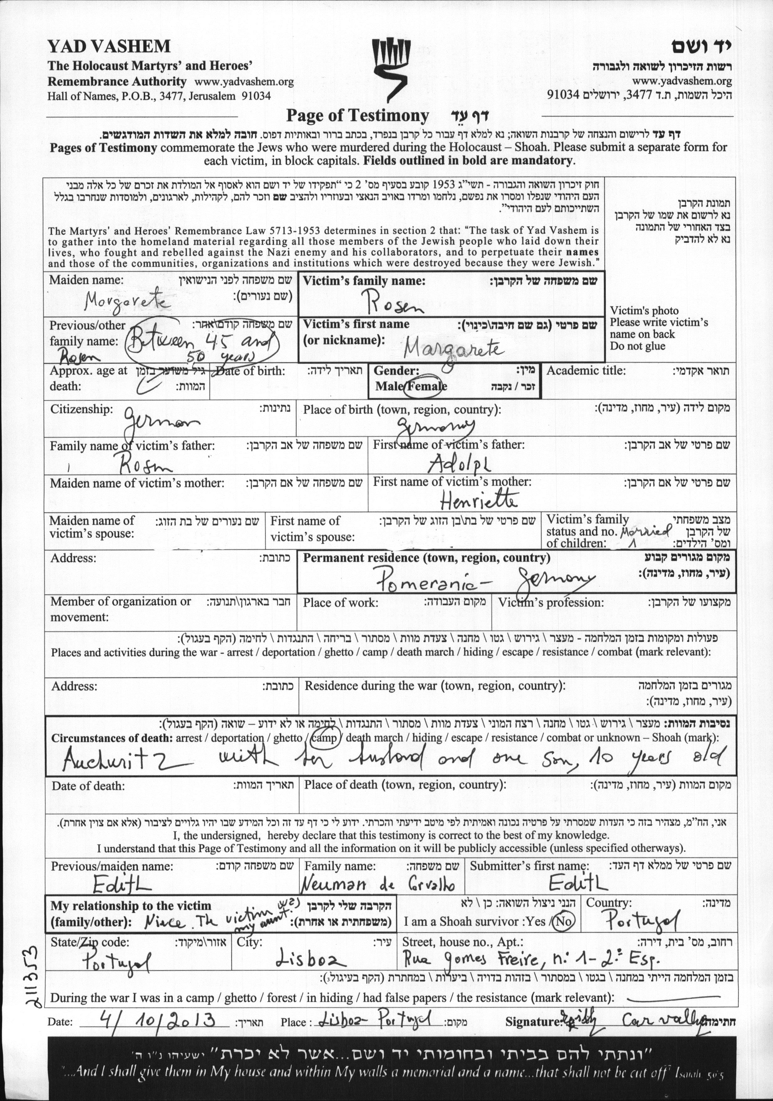 Маргарете Розен, место рождения: Германия. Отец: Адольф, mать:Хенриетте. Женат / замужем. Место жительства до войны: Померания, Германия. Место во время войны: ЛАГЕРЬ.