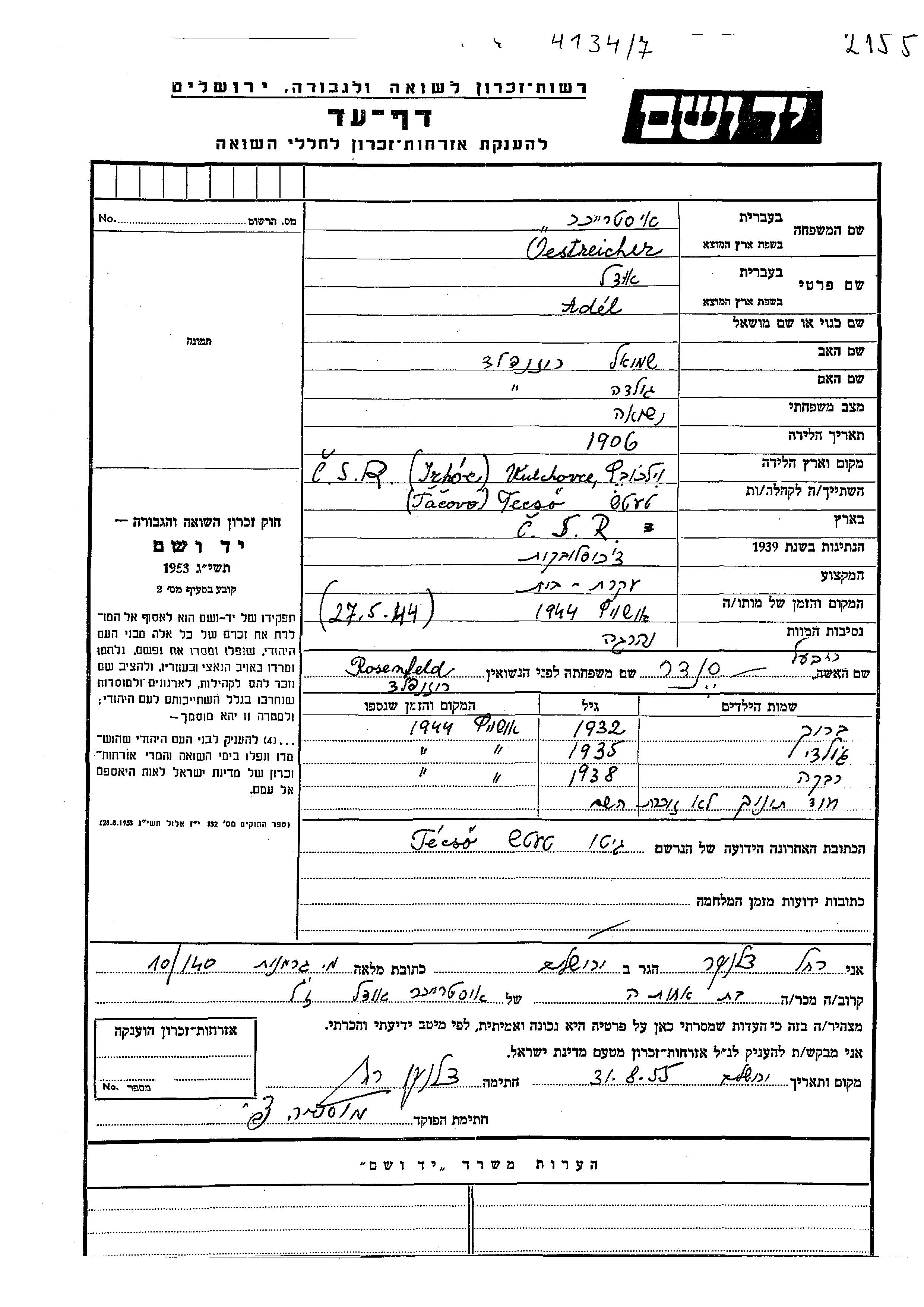Адель Эстрайхер, девичья фамилия Розенфельд, место рождения: Вульховце, Чехословакия. Отец: Шмуэль, mать:Голда. Домохозяйка. Женат / замужем. Место жительства до войны: Течё, Чехословакия.