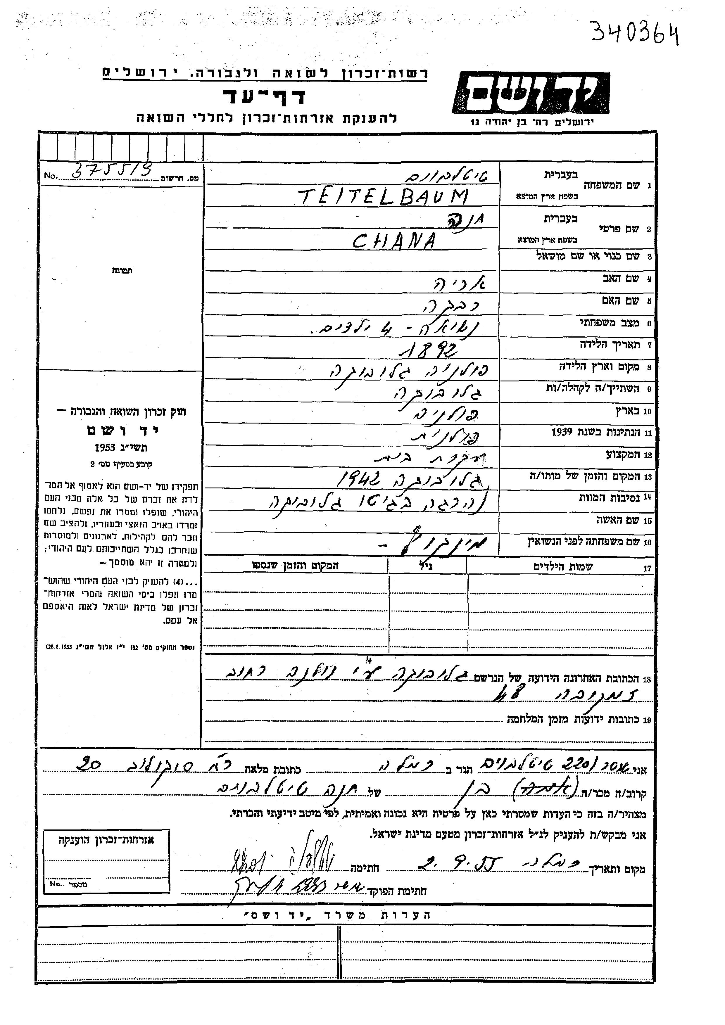 Хана Тейтельбойм, девичья фамилия Минков, место рождения: Глембоке, Польша. Отец: Арье, mать:Ривка. Домохозяйка. Женат / замужем. Место жительства до войны: Глембоке, Польша.