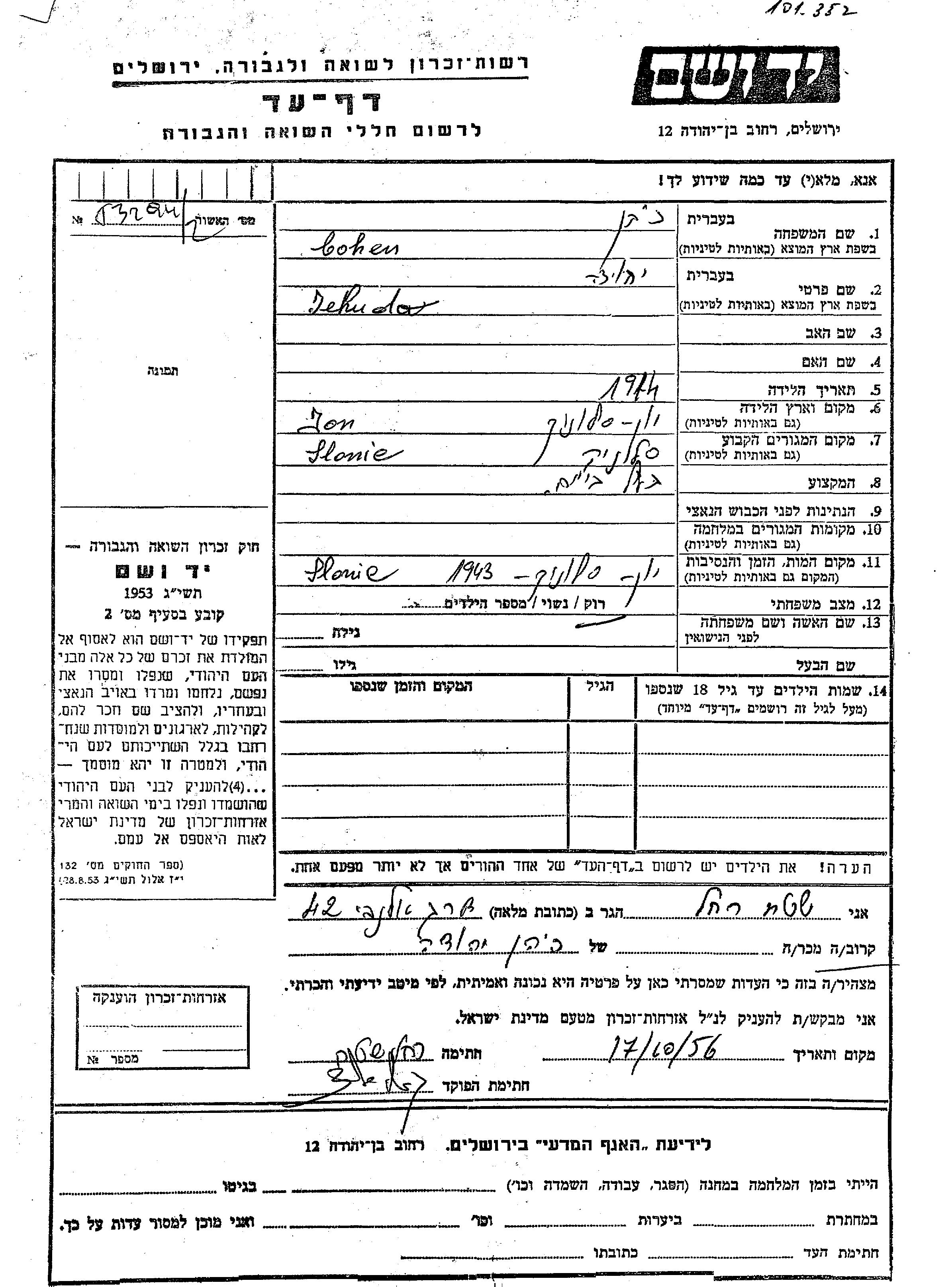 Иегуда Коэн, место рождения: Салоники, Греция. Фабрикант. Холост / не замужем. Место жительства до войны: Салоники, Греция.