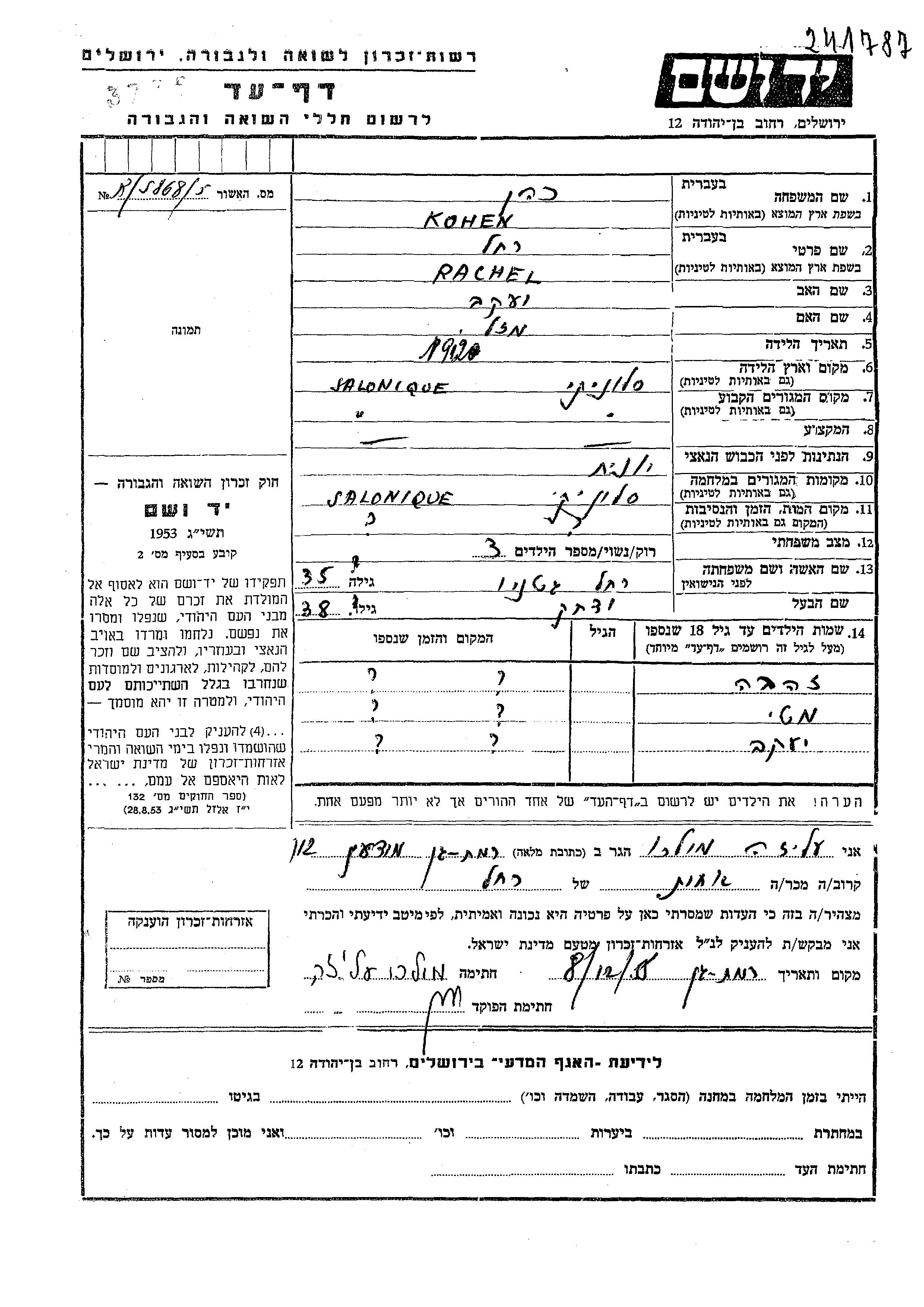 Коэн Рахель 1912 Салоники, Греция Лист свидетельских показаний