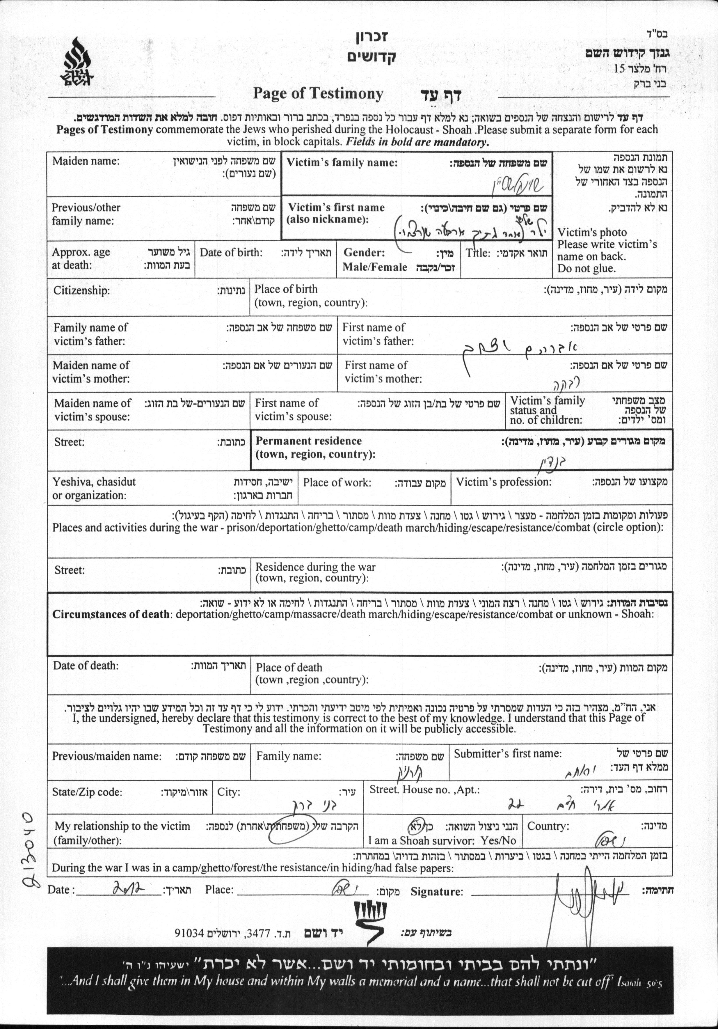 Яд Вашем - Листы свидетельских показаний Мемориального фонда