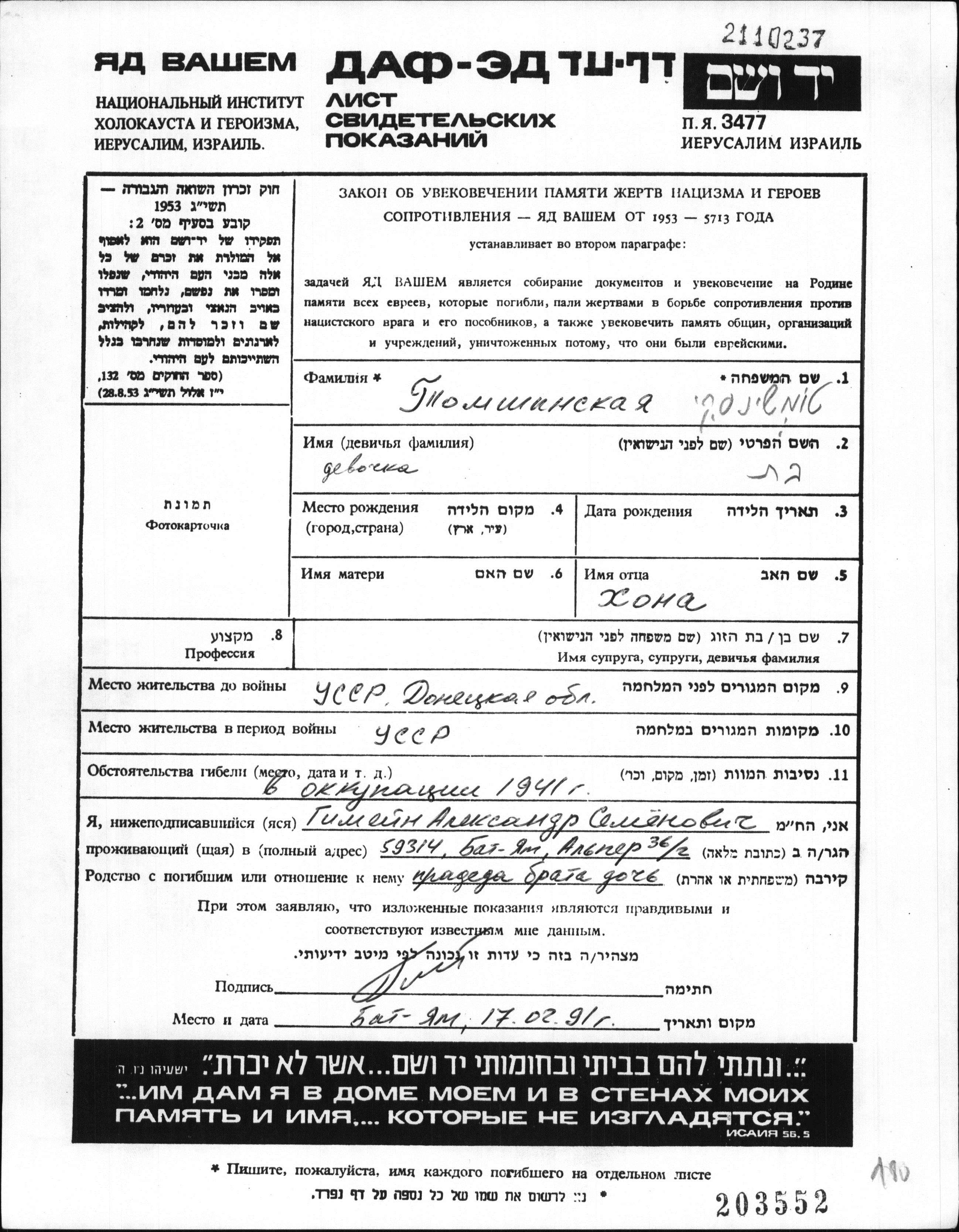 Томшинская Имя неизвестно Украина (СССР) Лист свидетельских показаний