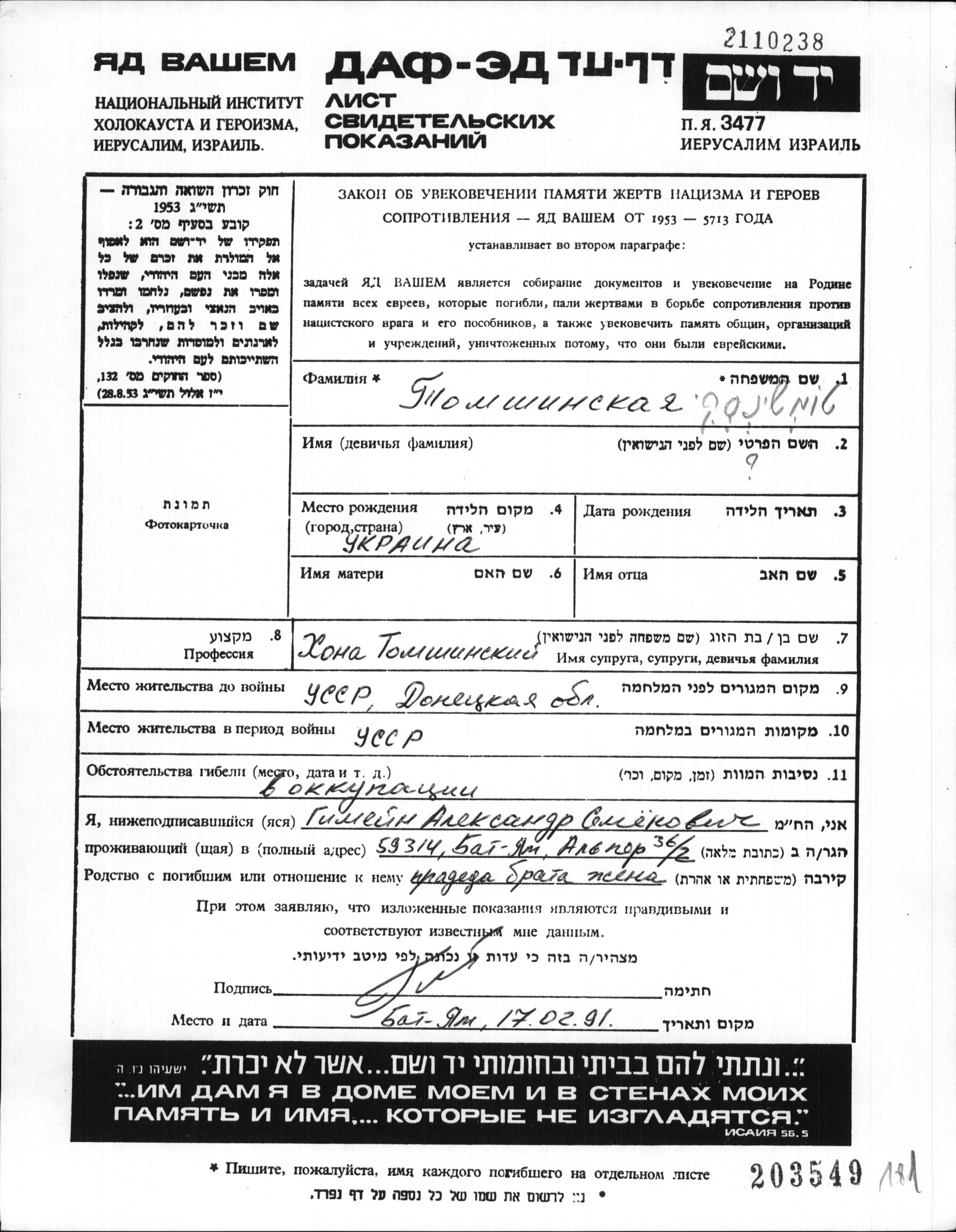 Томшинская Имя неизвестно Донецкий Бассейн, СССР Лист свидетельских показаний