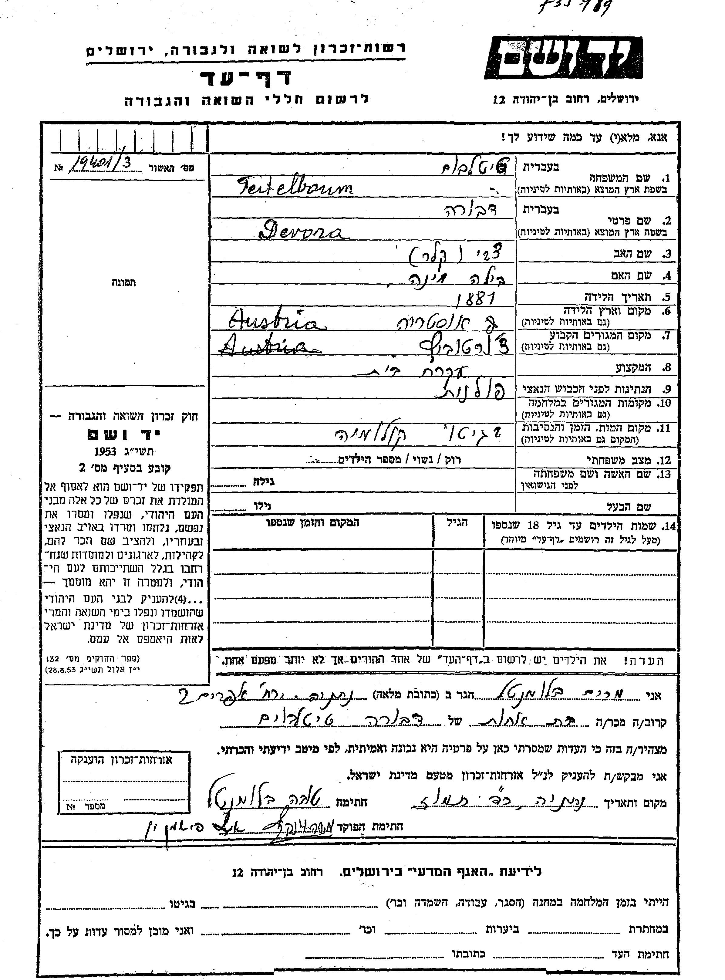 Девора Тейтельбаум, место рождения: Австрия. Отец: Цви Хелер, mать:Била Мина. Домохозяйка. Место жительства до войны: Certovec, Чехословакия.