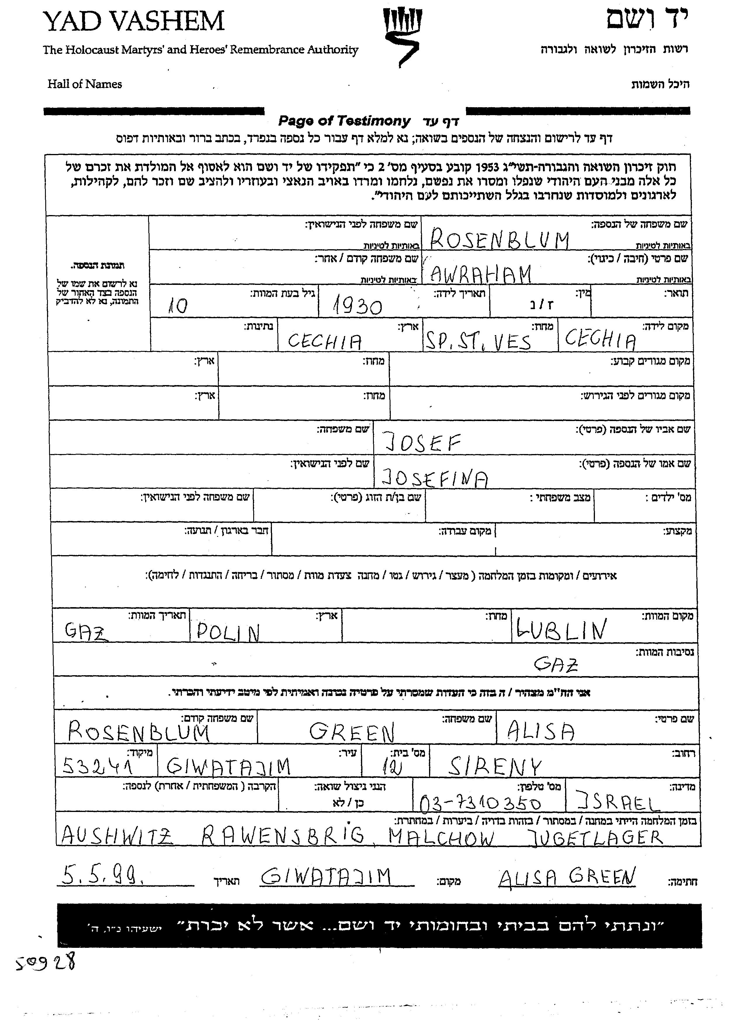 Авраам Розенблюм, место рождения: Чехословакия. Отец: Йосеф, mать:Йозефина.