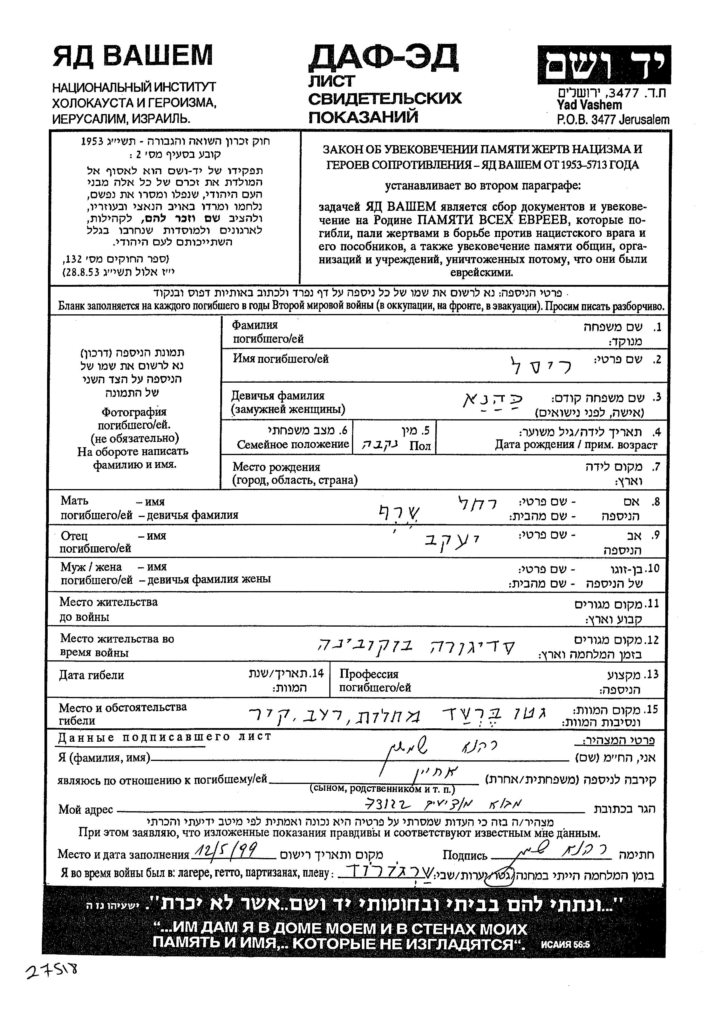 Яд Вашем - Листы свидетельских показаний Мемориального фонда