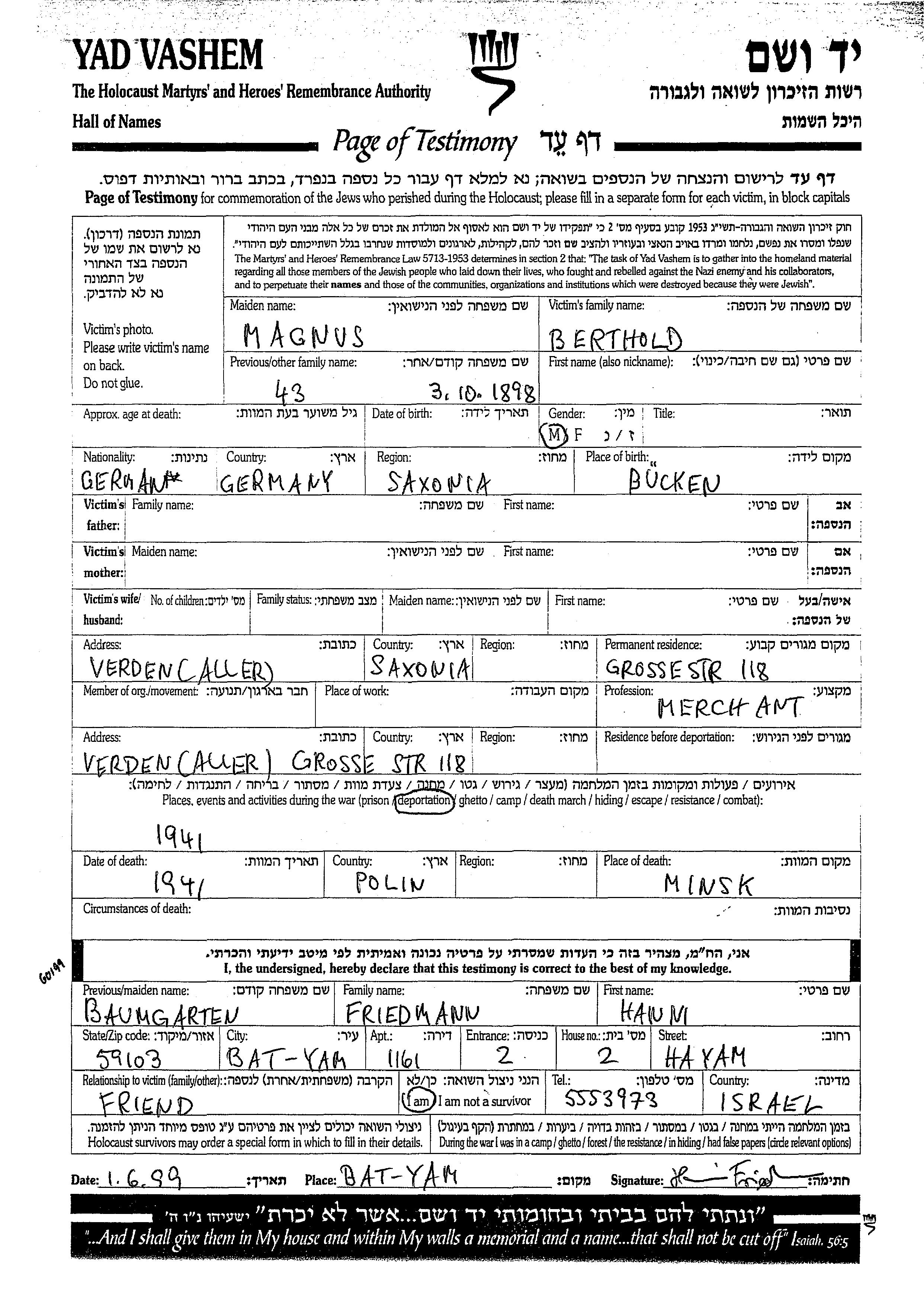 Бертольд Магнус 1898 Ферден, Германия Лист свидетельских показаний