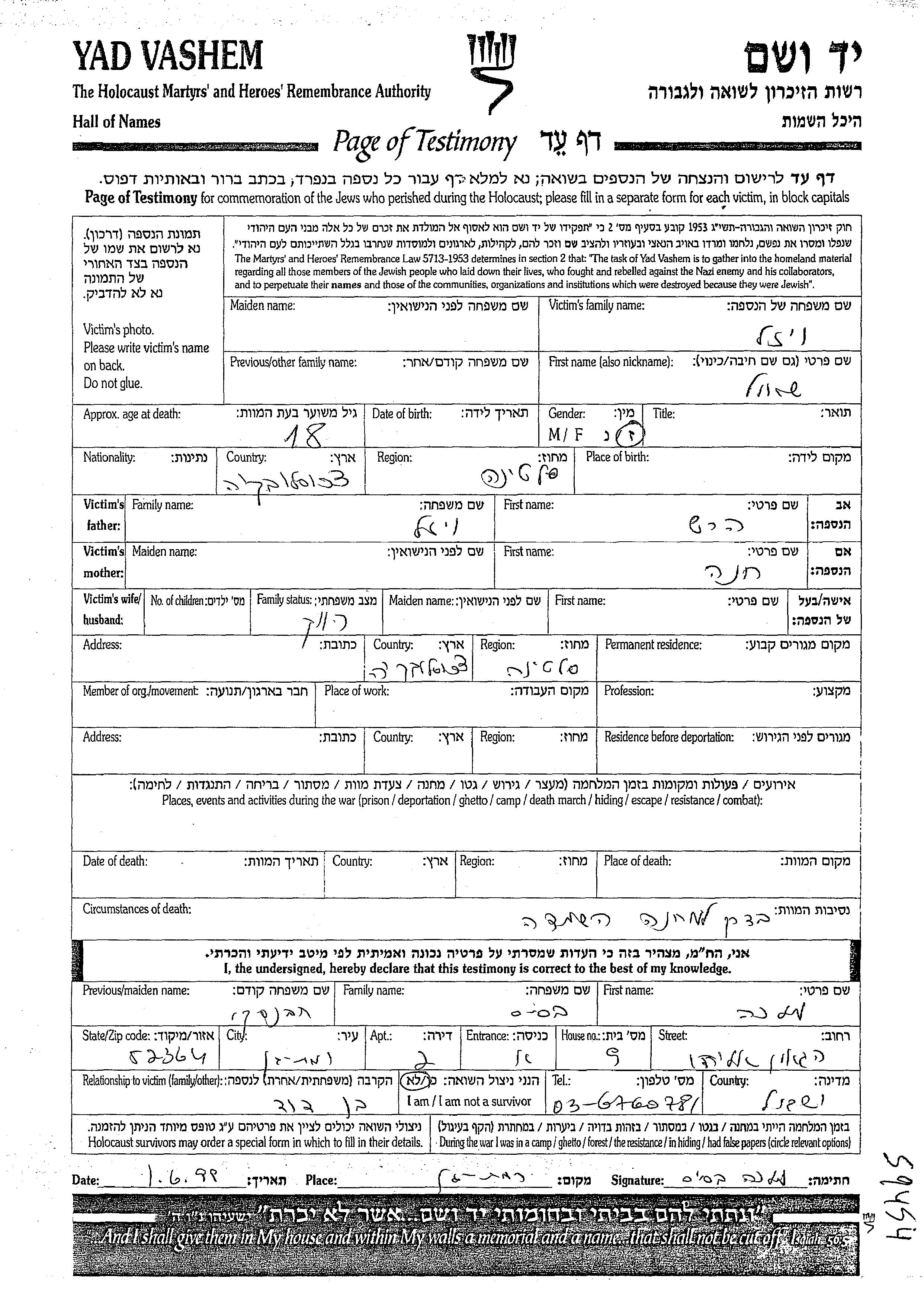 Визель Шауль Слатина, Чехословакия Лист свидетельских показаний