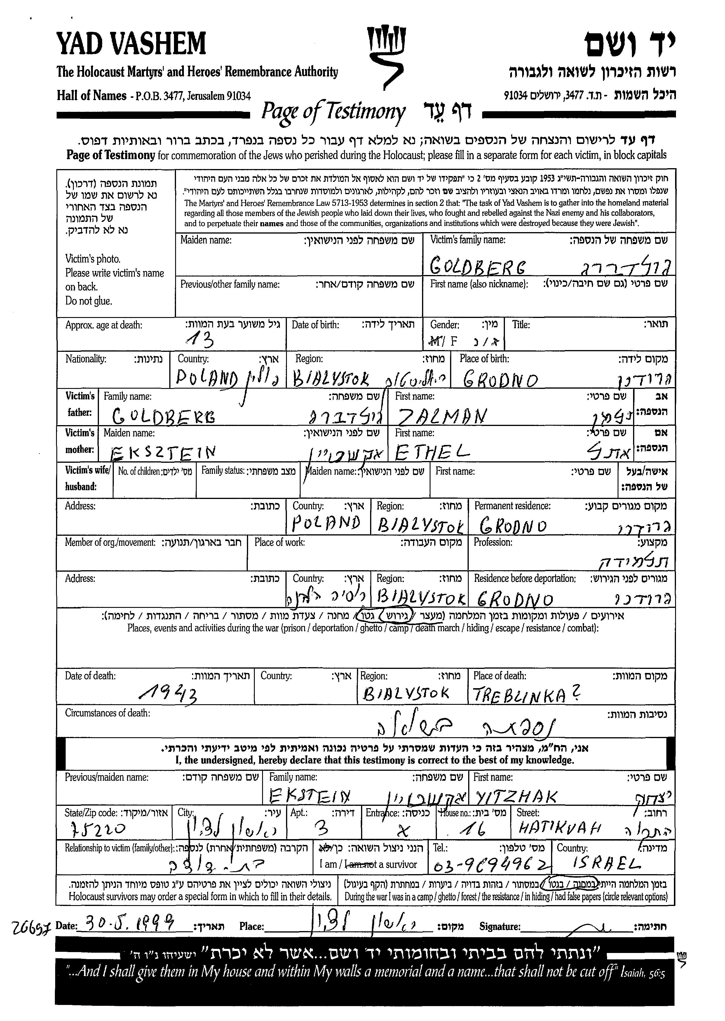 Имя неизвестно Гольдберг, место рождения: Гродно, Польша. Отец: Залман, mать:Этель. Ученик / ученица. Место жительства до войны: Гродно, Польша. Место во время войны: Гродно, Польша.
