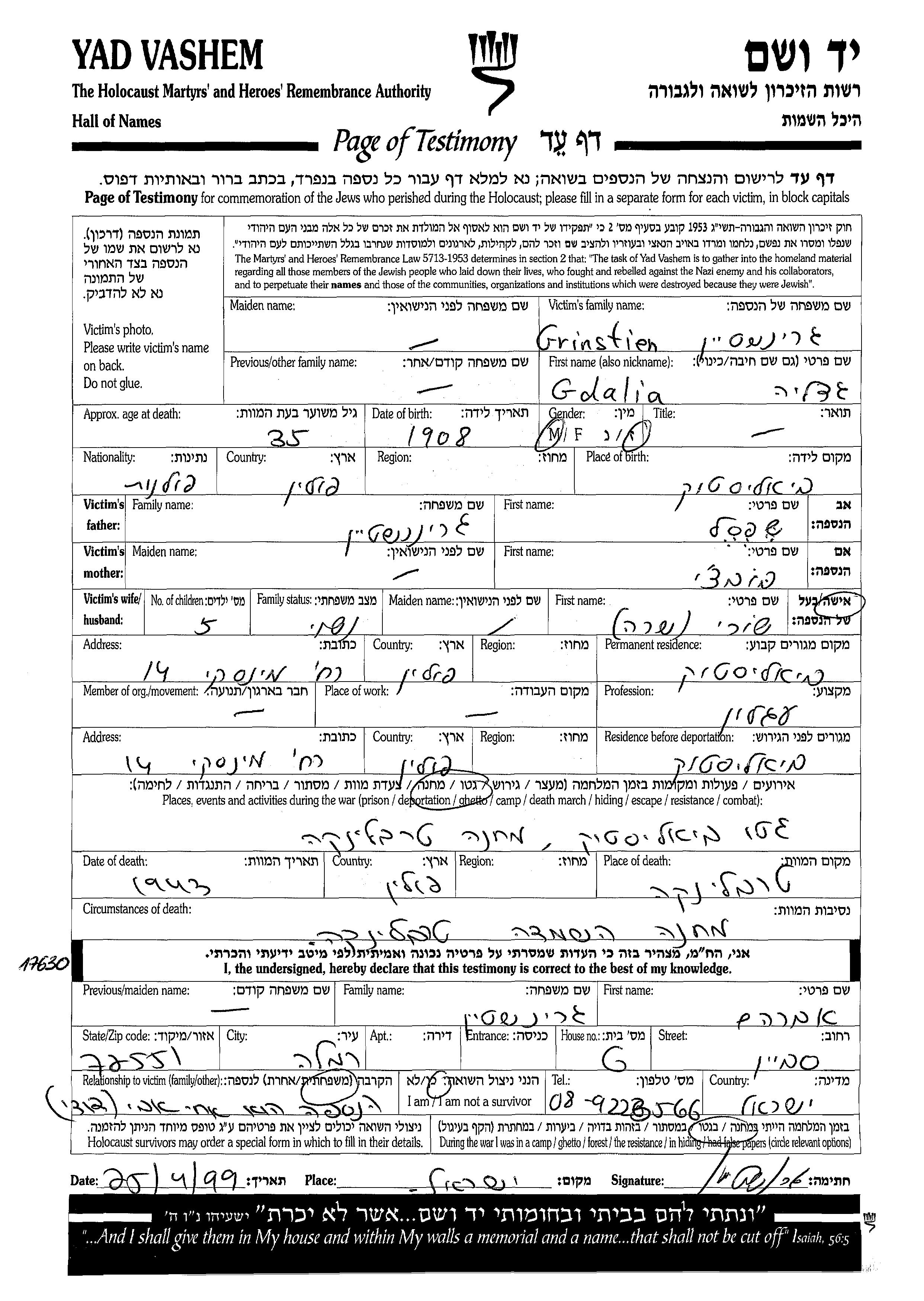 Гдалия Гринштен, место рождения: Белосток, Польша. Отец: Шепсел, mать:Бобци. Извозчик. Женат / замужем. Место жительства до войны: Белосток, Польша. Место во время войны: Белосток, Польша.