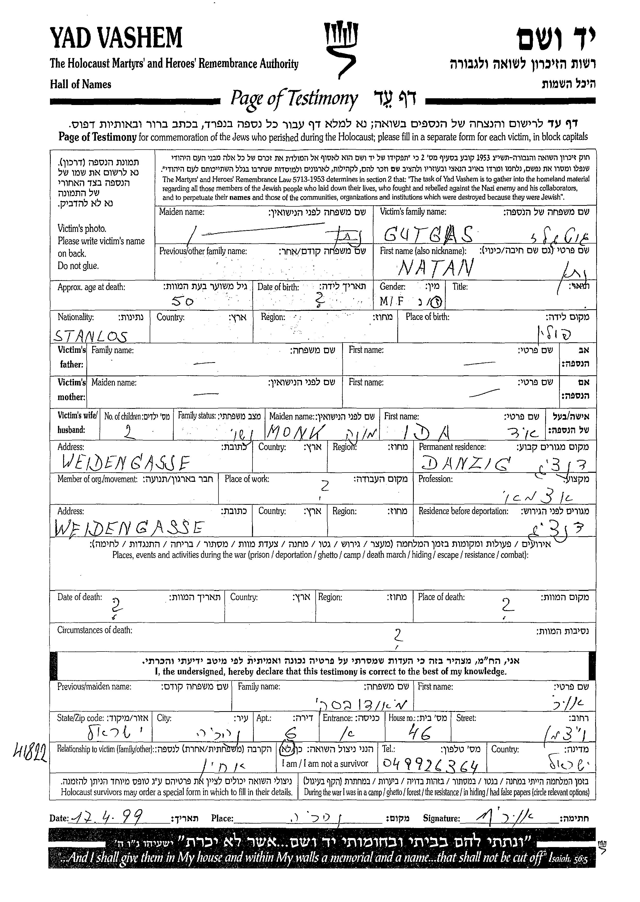 Натан Гутглас, место рождения: Польша. Частный предприниматель. Женат / замужем. Место жительства до войны: Данциг, Данциг. Место во время войны: Данциг, Данциг.