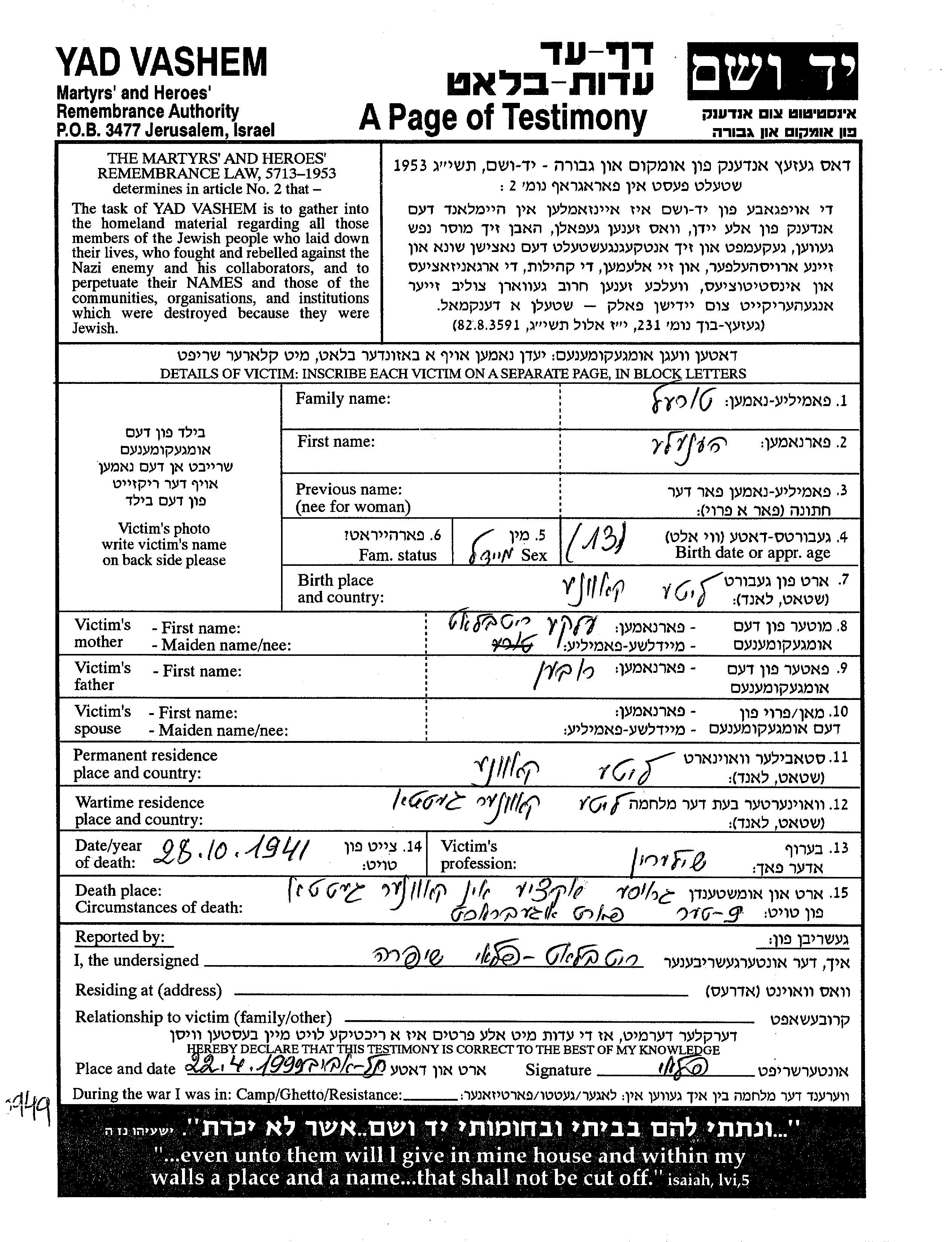 Яд Вашем - Листы свидетельских показаний Мемориального фонда