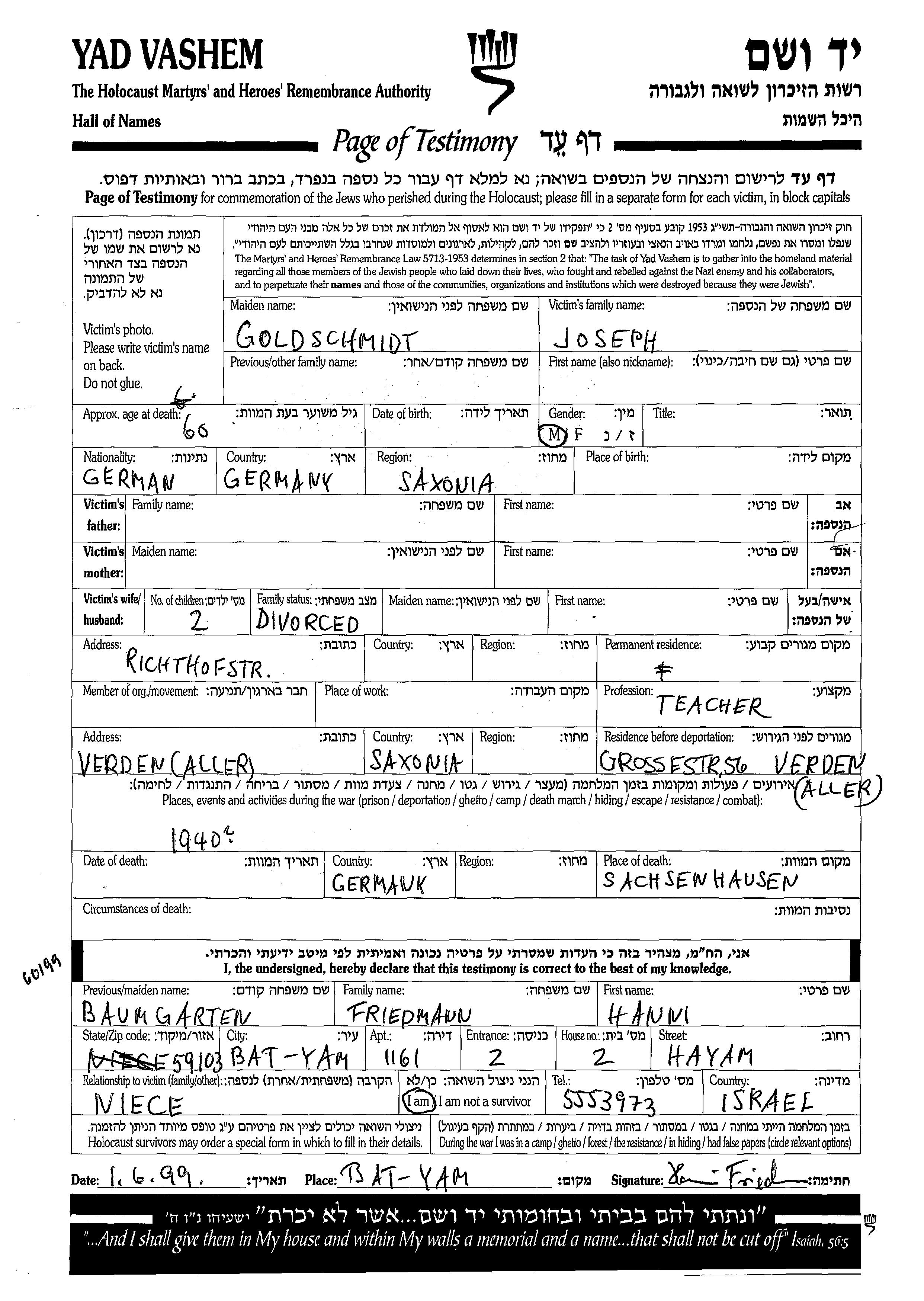 Йосеф Гольдшмидт, место рождения: Саксония, Германия. Учитель / учительница. Разведен / разведена. Место жительства до войны: Саксония, Германия. Место во время войны: Ферден-Аллер, Германия.
