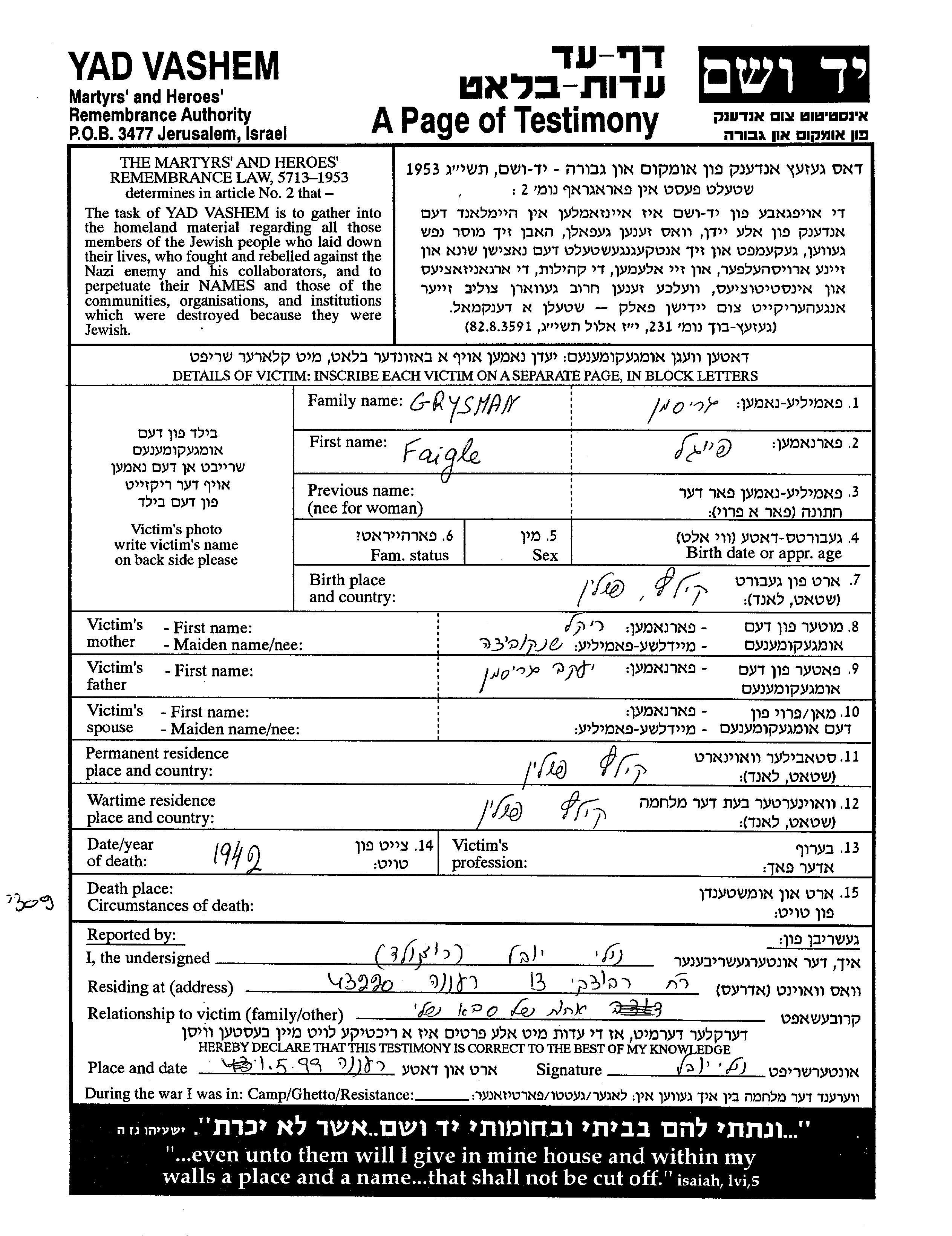 Файгле Грисман, место рождения: Кельце, Польша. Отец: Яков, mать:Рикель. Место жительства до войны: Кельце, Польша. Место во время войны: Кельце, Польша.