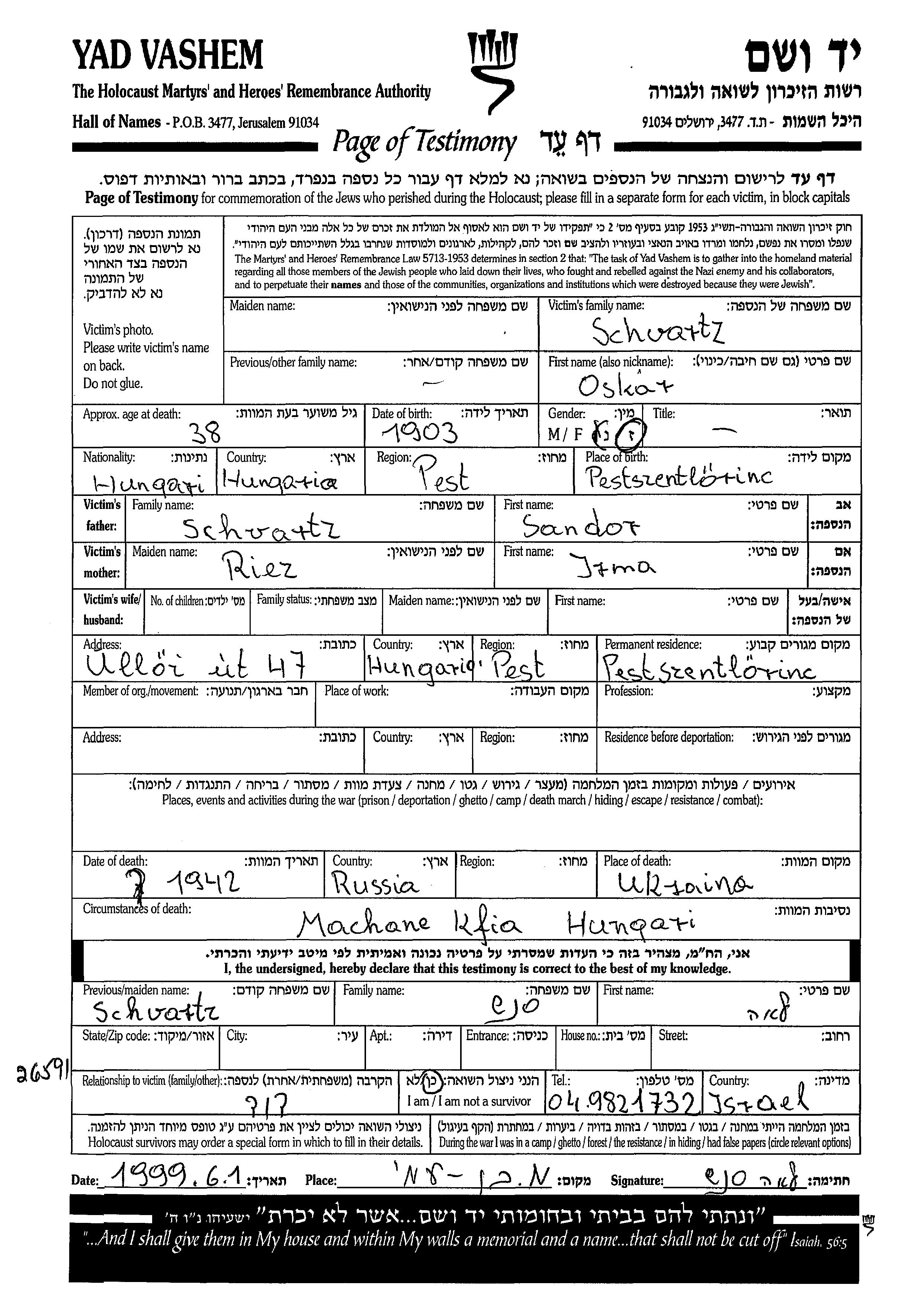 Оскар Шварц, место рождения: Пештсентлёринц, Венгрия. Отец: Сандор, mать:Ирма. Место жительства до войны: Пештсентлёринц, Венгрия.