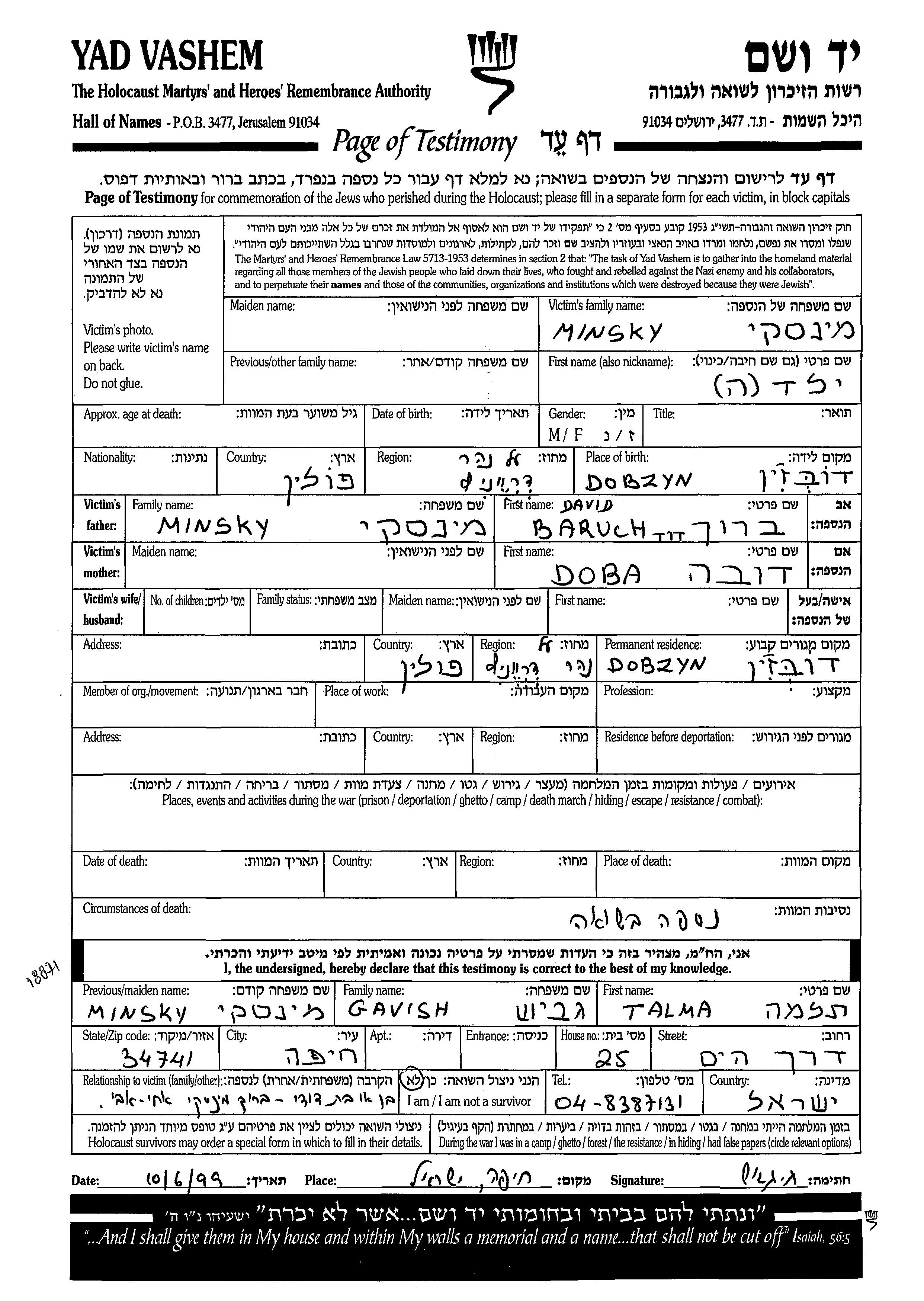 Имя неизвестно Мински родился/родилась, место рождения: Добжинь, Польша. Отец: Давид Барух, mать:Доба. Место жительства до войны: Добжинь, Польша.