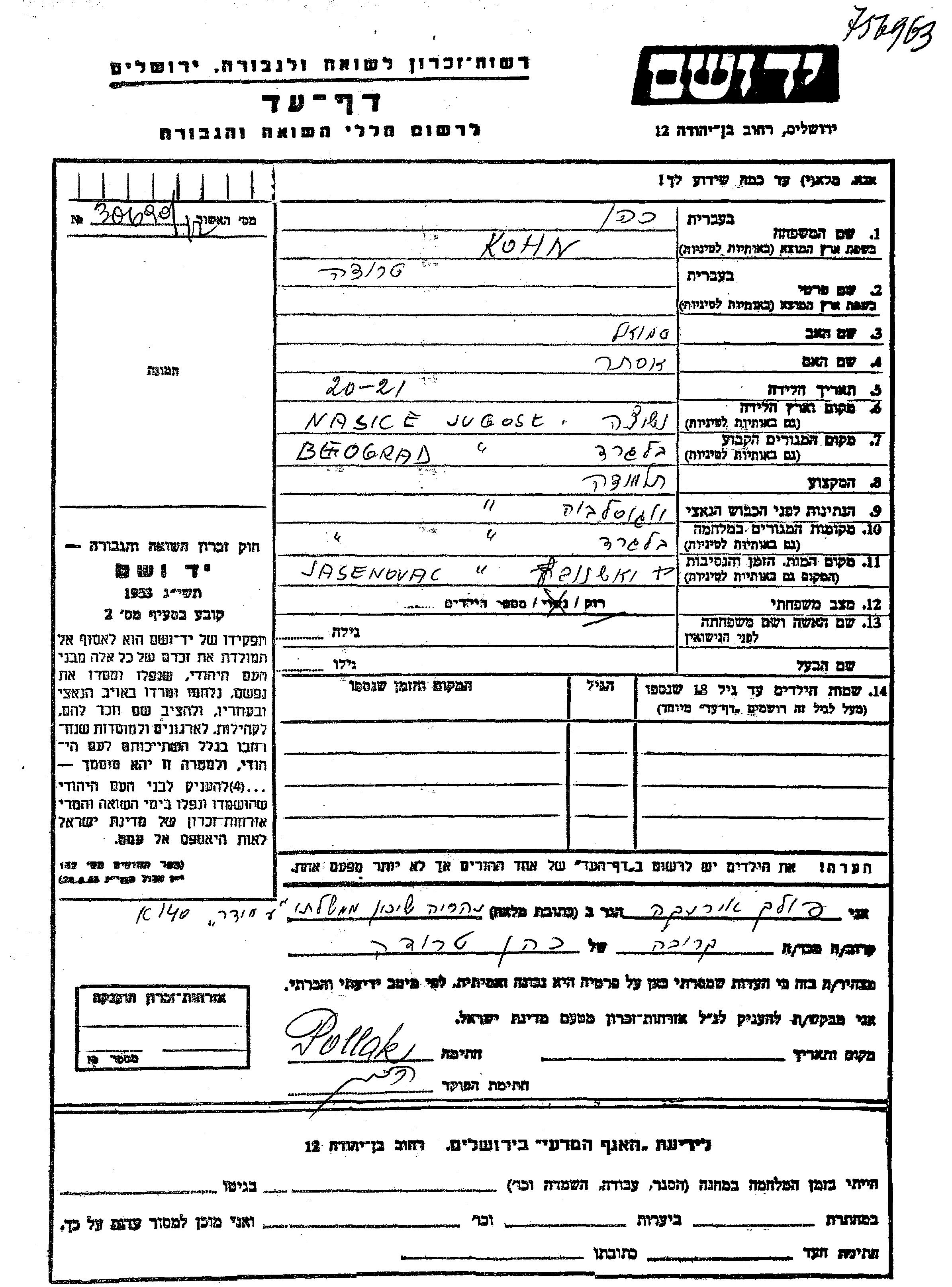 Труде Кон, место рождения: Нашице, Югославия. Отец: Шмуэль, mать:Эстер. Ученик / ученица. Холост / не замужем. Место жительства до войны: Белград, Югославия. Место во время войны: Белград, Югославия.