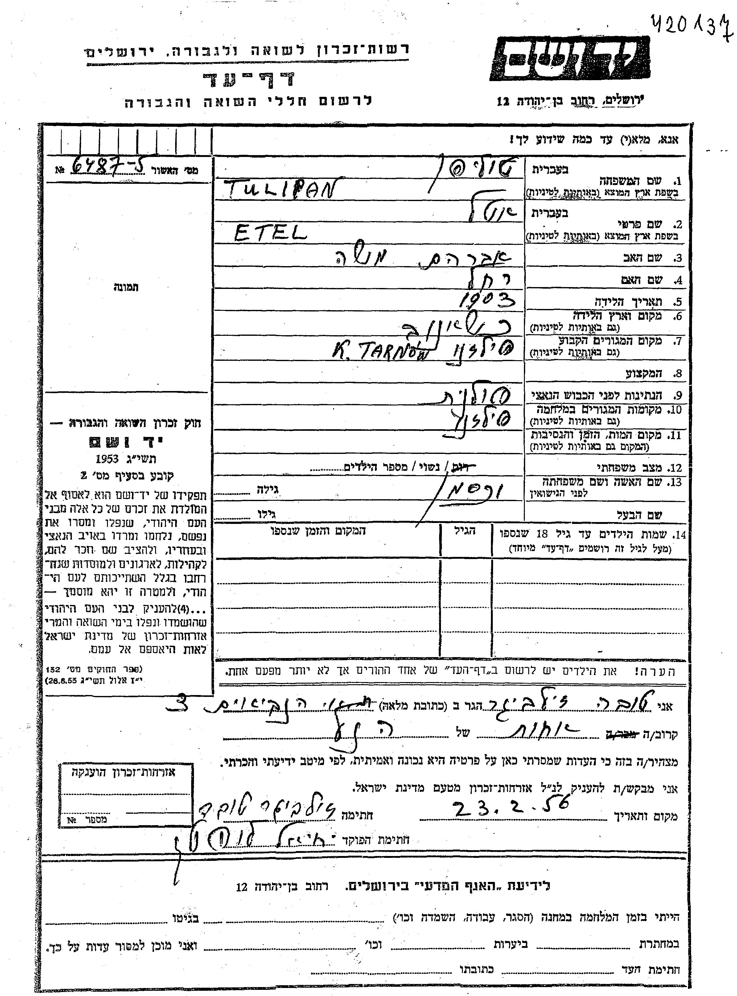 Этель Тулипан, девичья фамилия Ваксман, место рождения: Хшанув, Польша. Отец: Авраам Моше, mать:Рахель. Женат / замужем. Место жительства до войны: Пильзно, Польша. Место во время войны: Пильзно, Польша.