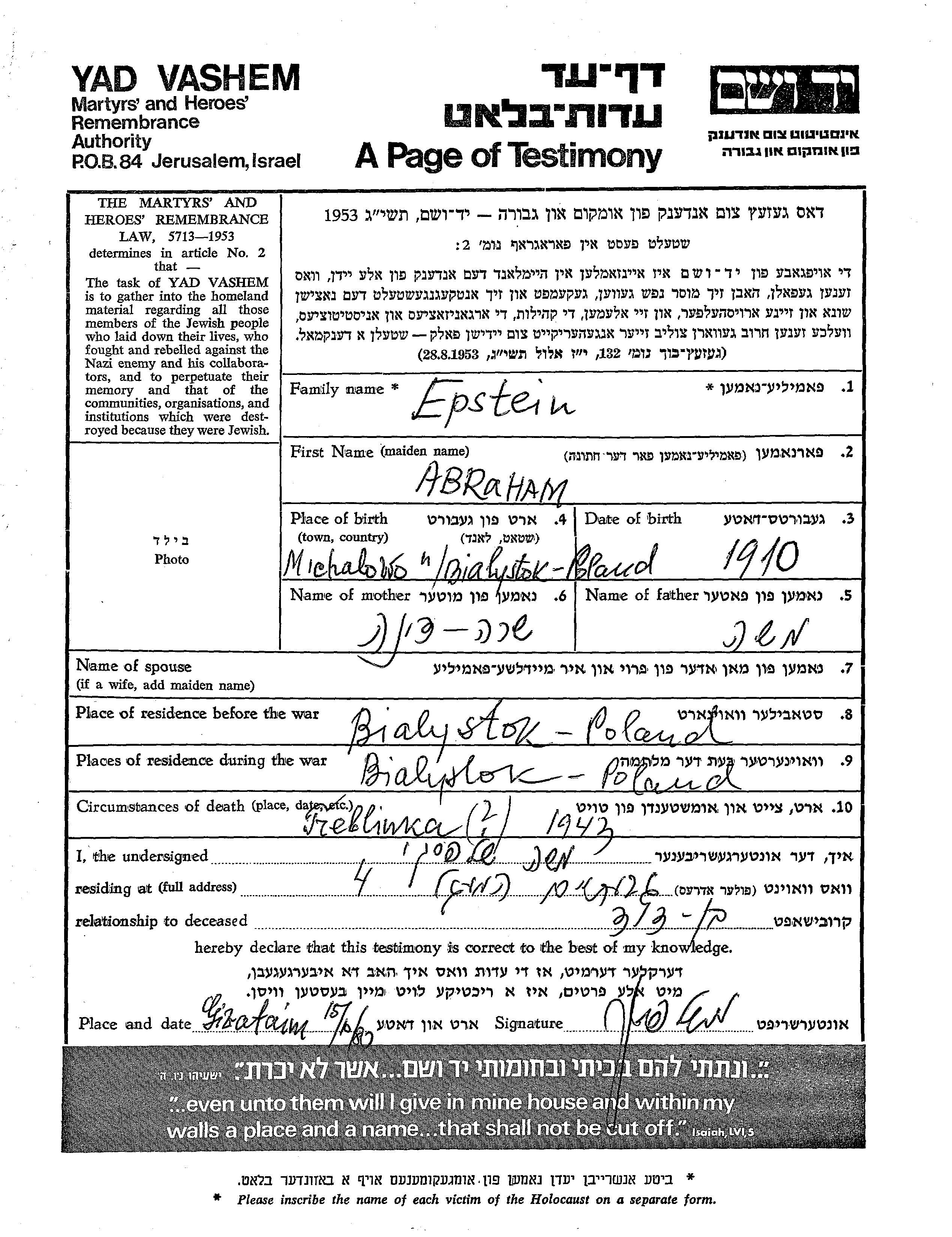 Эпштейн Абраам 1910 Белосток, Польша Лист свидетельских показаний