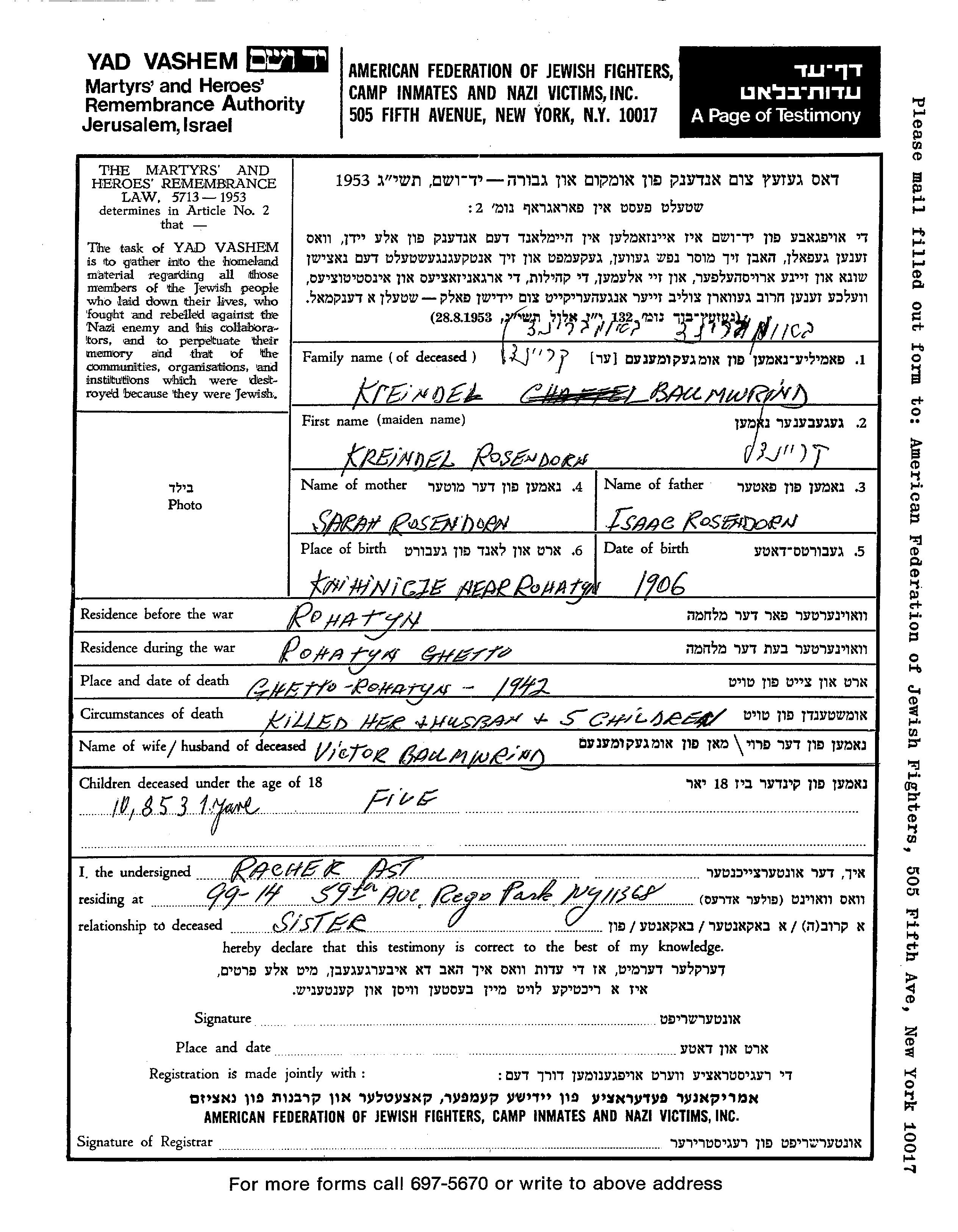 Крейндель Баумвринд, девичья фамилия Розендорн, место рождения: Княгиничи, Польша. Отец: Исаак, mать:Сара. Женат / замужем. Место жительства до войны: Рогатин, Польша. Место во время войны: Рогатин, Польша.