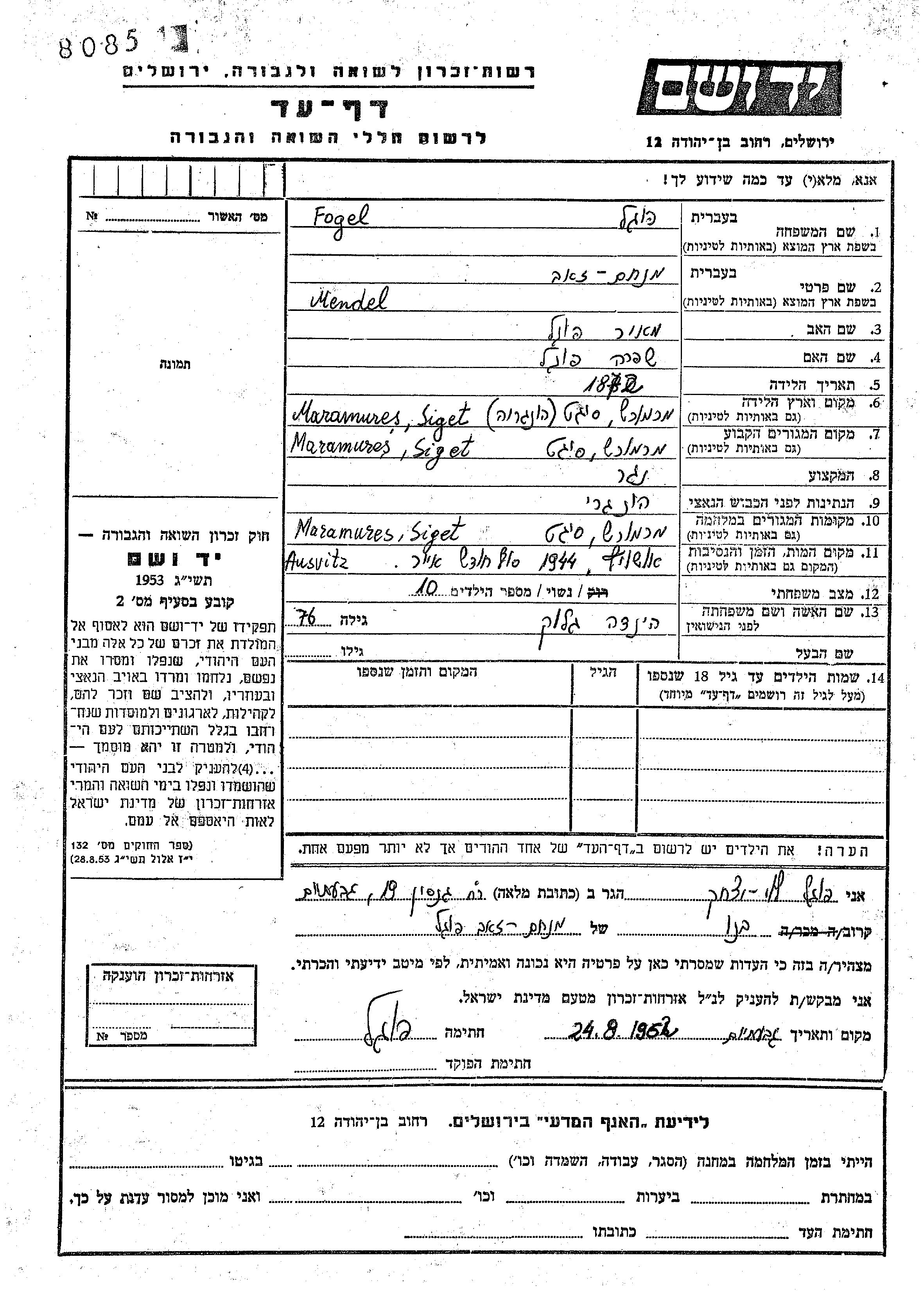 Мендель Менахем Зеев Фогель, место рождения: Сигет, Румыния. Отец: Меир, mать:Шифра. Столяр / плотник. Женат / замужем. Место жительства до войны: Сигет, Румыния. Место во время войны: Сигет, Румыния.