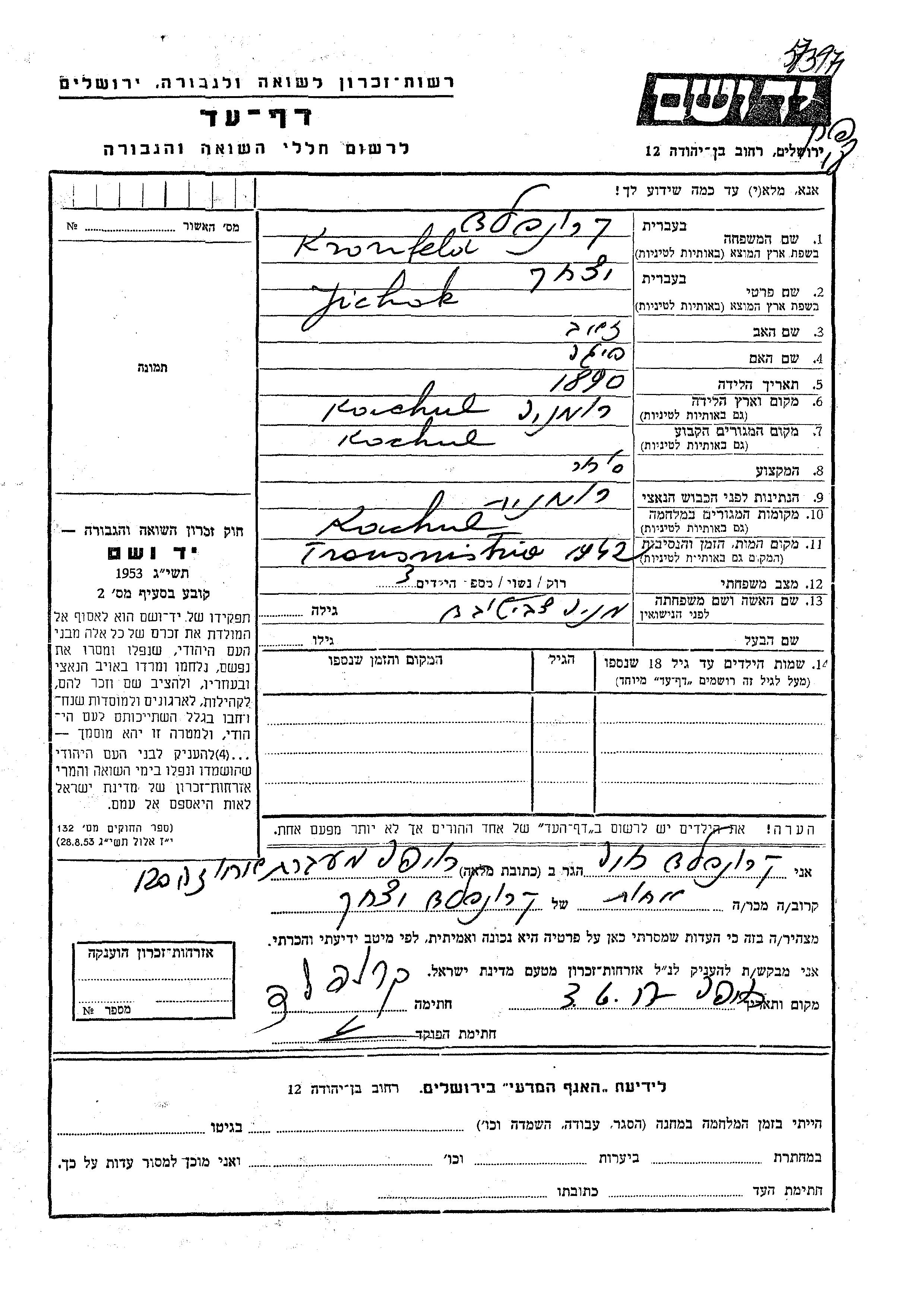Ицхак Кронфельд, место рождения: Кахул, Румыния. Отец: Зеев, mать:Фейга. Торговец / торговка. Женат / замужем. Место жительства до войны: Кахул, Румыния. Место во время войны: Кахул, Румыния.