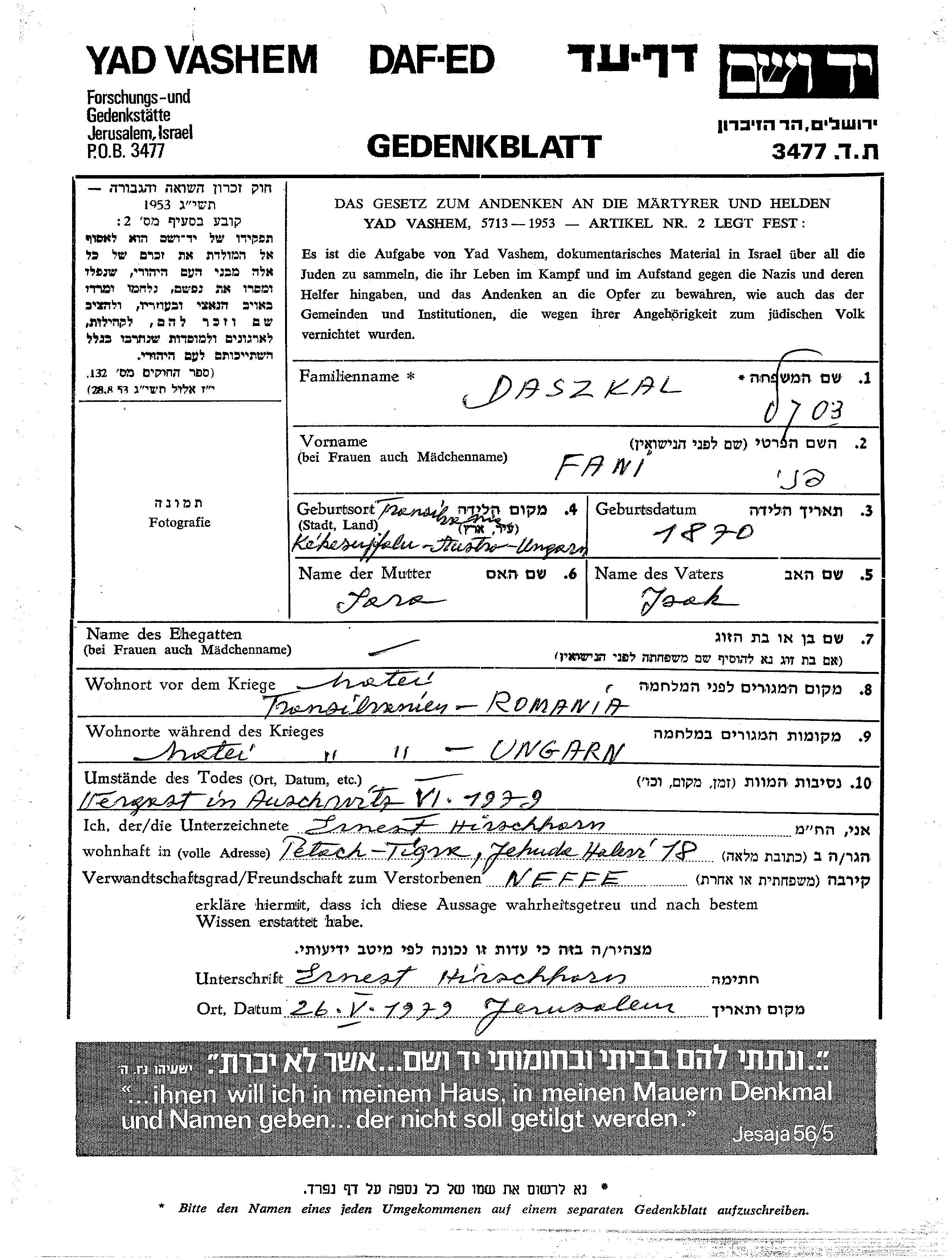 Фани Даскаль, место рождения: Кекешуйфалу, Румыния. Отец: Изак, mать:Сара. Место жительства до войны: Матей, Румыния. Место во время войны: Матей, Румыния.