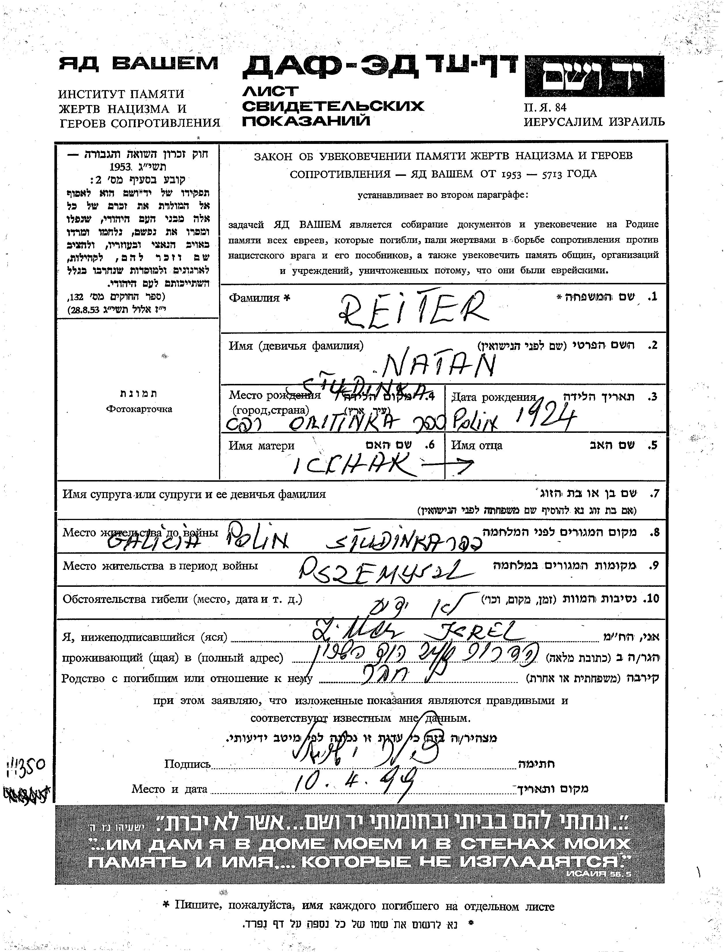 Натан Рейтер, место рождения: Студинка, Польша. Отец: Ицхак. Место жительства до войны: Студинка, Польша. Место во время войны: Пшемысль, Польша.