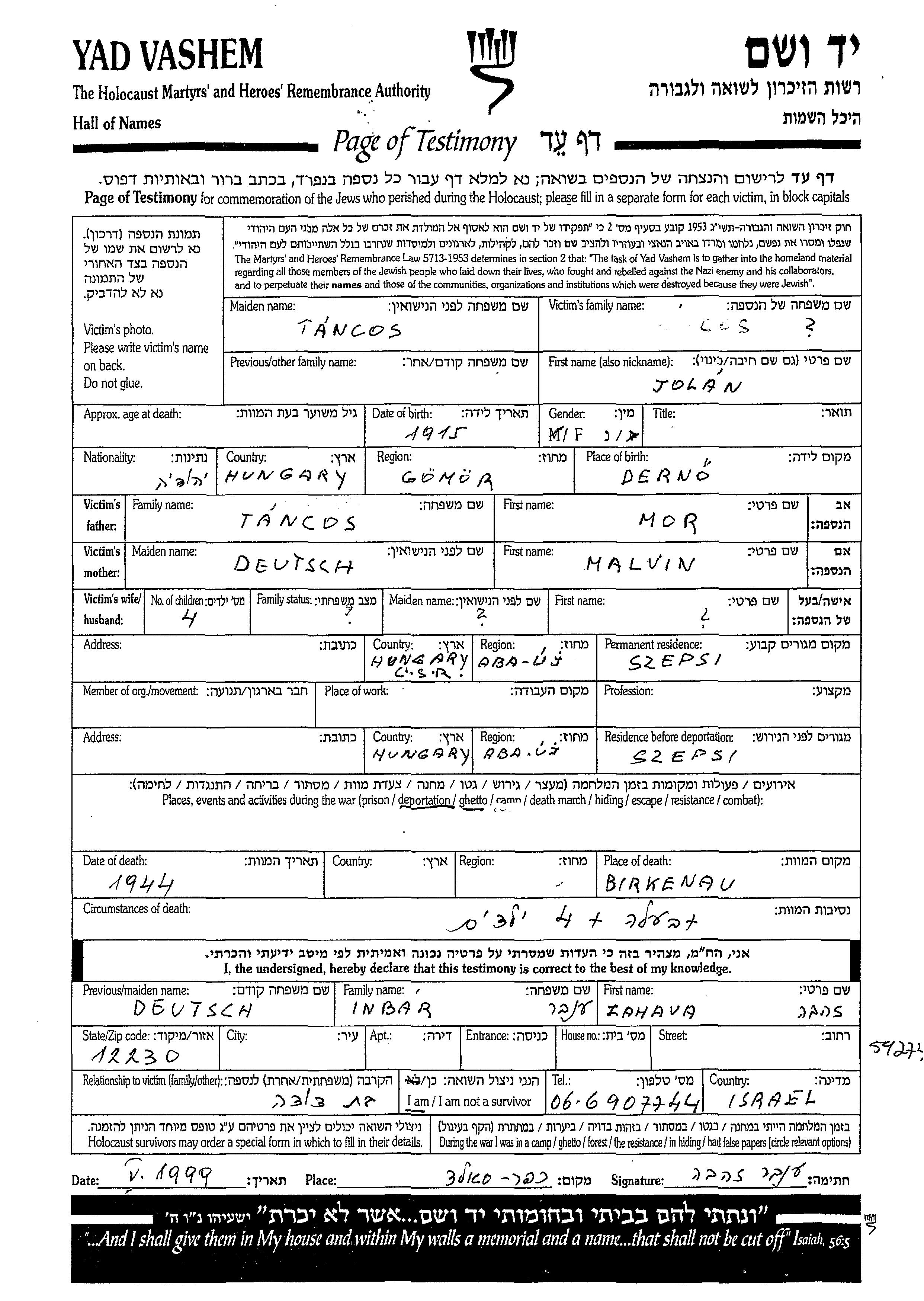 Йолан Фамилия неизвестна, девичья фамилия Танцош, место рождения: Дернё, Чехословакия. Отец: Мор, mать:Мальвин. Место жительства до войны: Сепши, Чехословакия. Место во время войны: Сепши, Чехословакия.