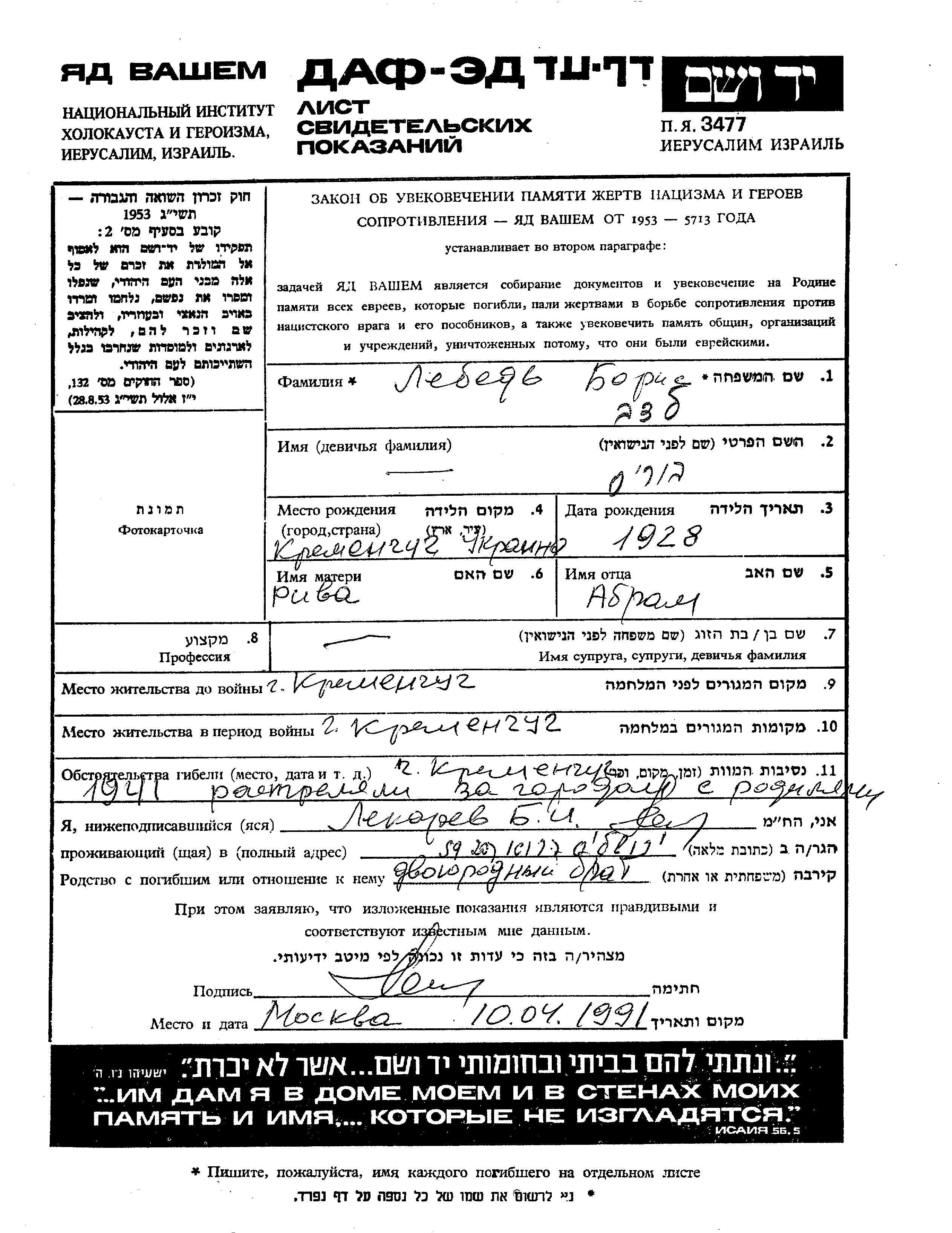 Лебедь Борис 1928 Кременчуг, Украина (СССР) Лист свидетельских показаний