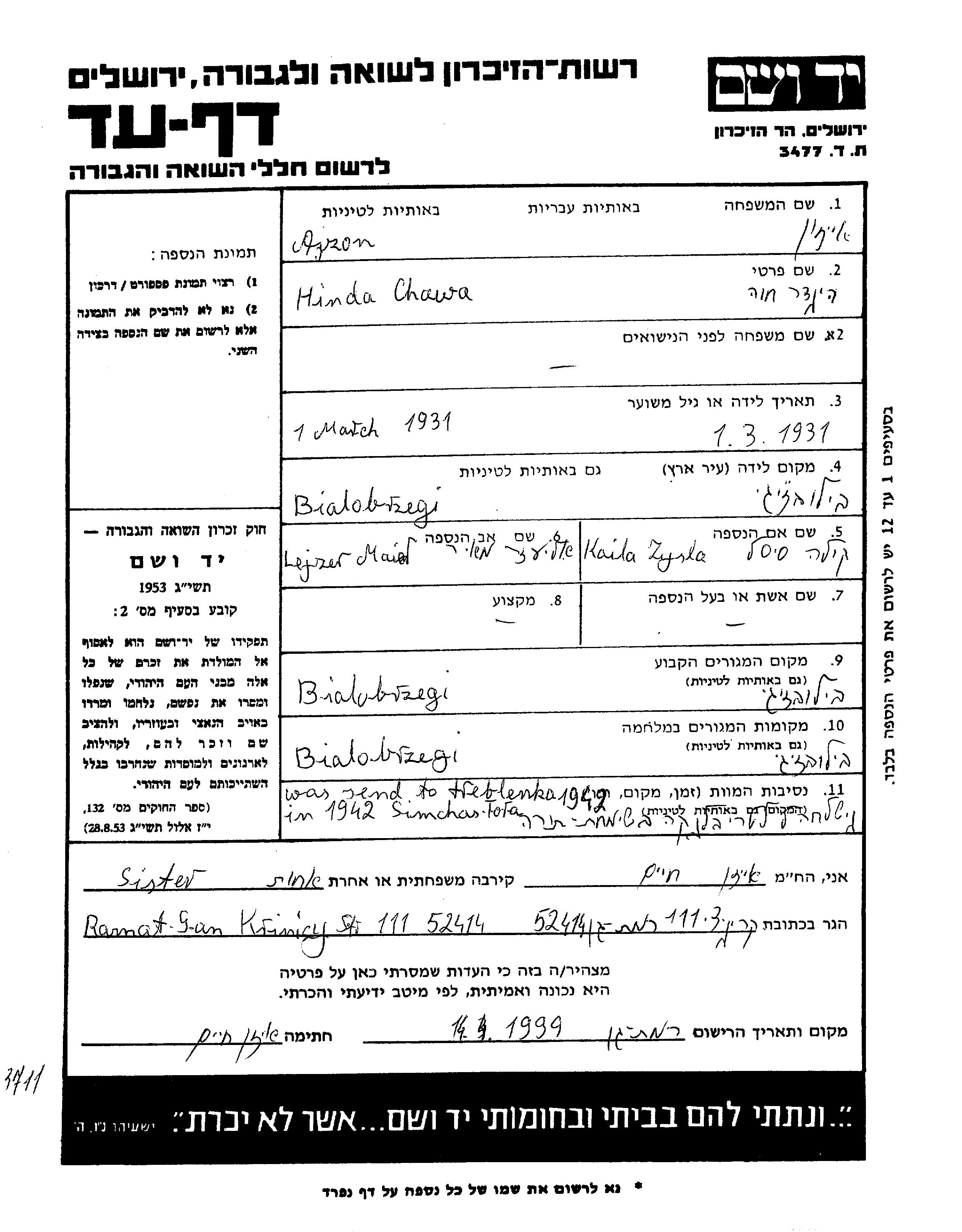 Айзон Хава Хинда 1931 Бялобжеги, Польша Лист свидетельских показаний