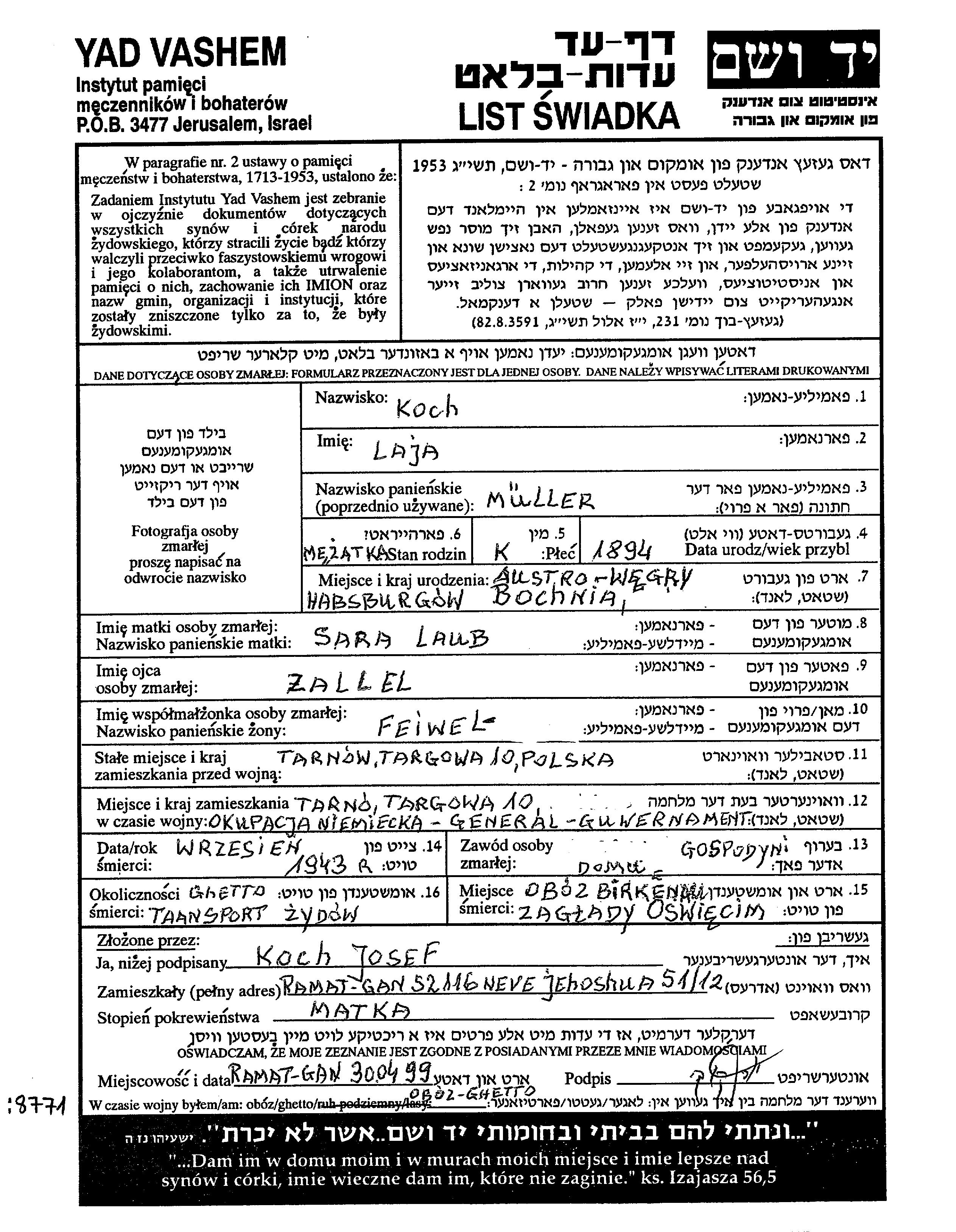 Лая Кох, девичья фамилия Муллер, место рождения: Бохня, Польша. Отец: Цаллель, mать:Сара. Домохозяйка. Женат / замужем. Место жительства до войны: Тарнув, Польша. Место во время войны: Тарнув, Польша.