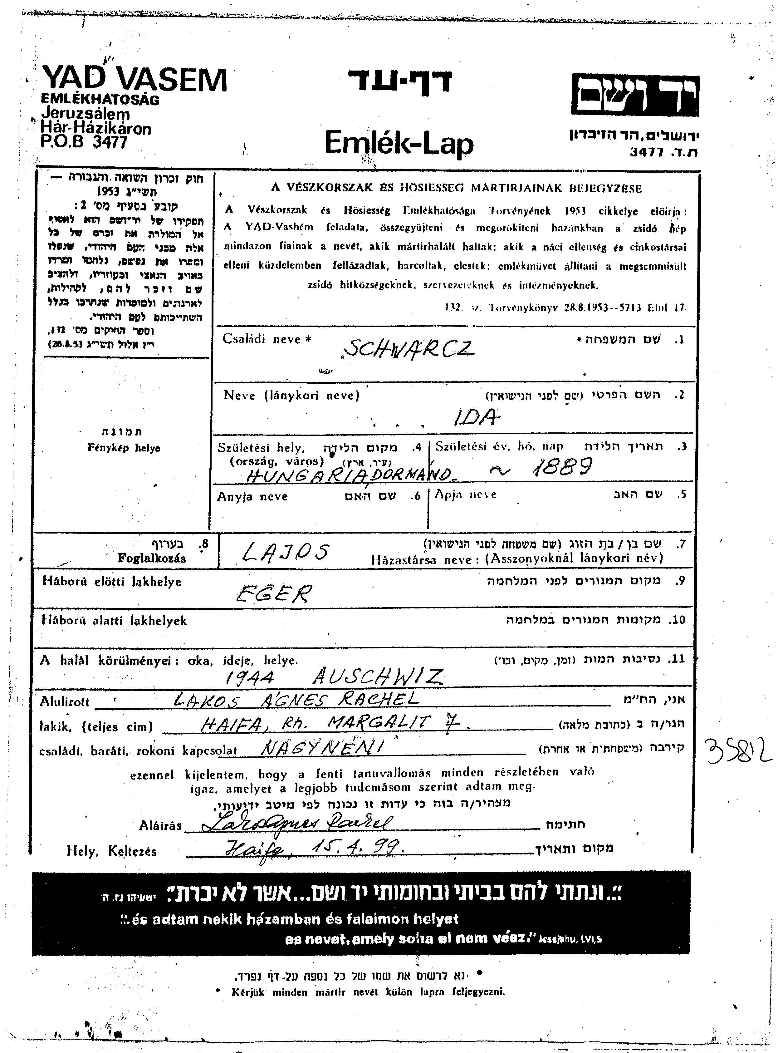 Ида Шварц, место рождения: Дорманд, Венгрия. Женат / замужем. Место жительства до войны: Эгер.