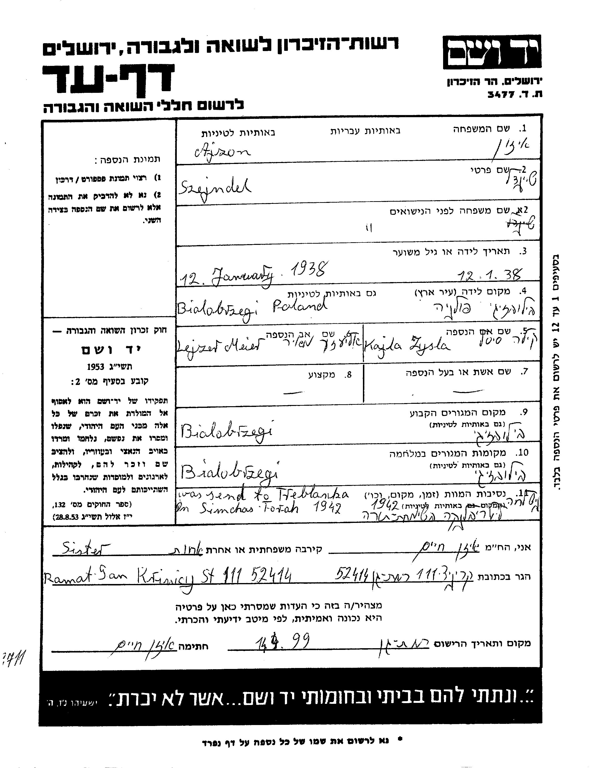 Айзон Шейндель 1938 Бялобжеги, Польша Лист свидетельских показаний