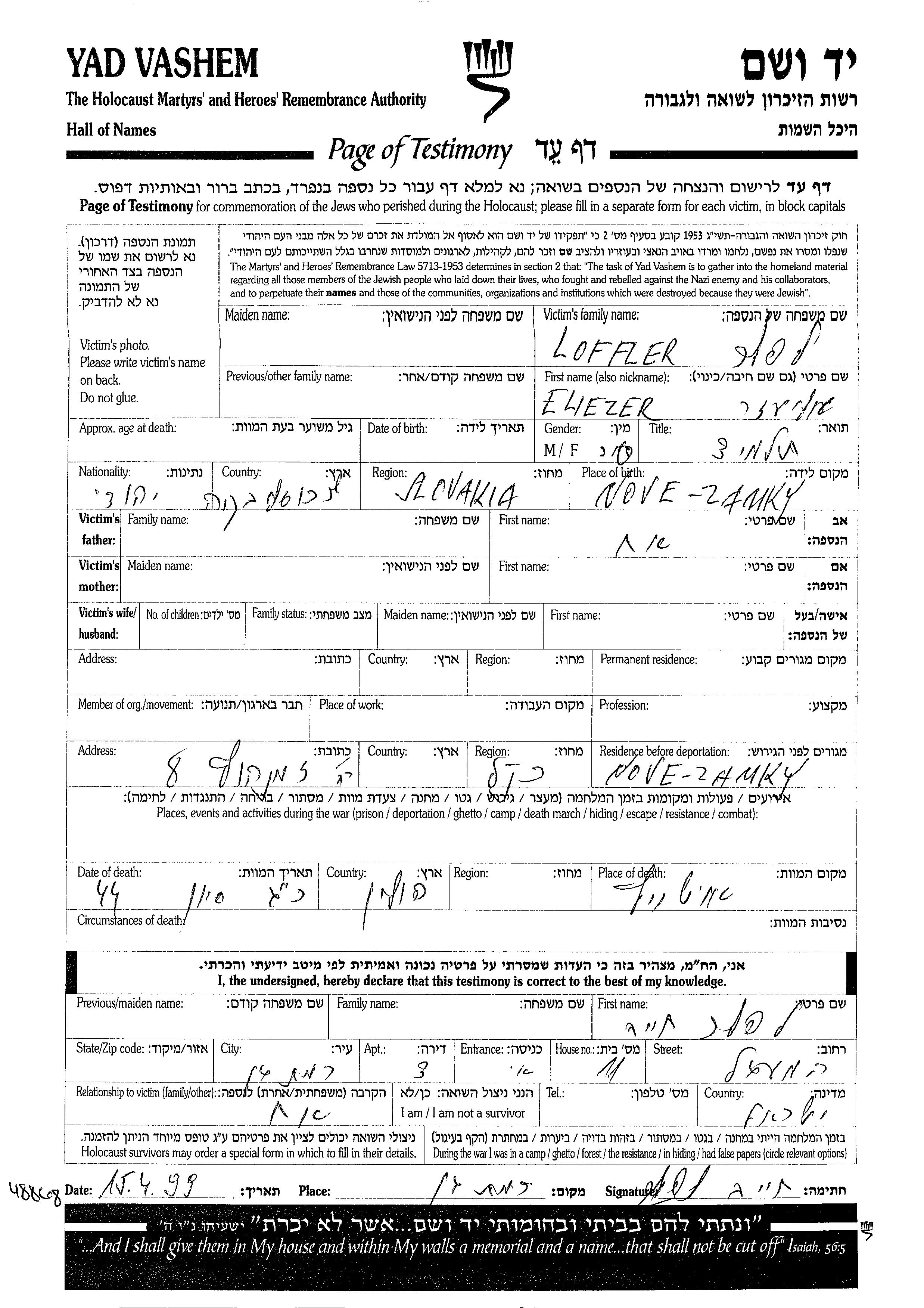 Элиэзер Лоффлер, место рождения: Нове-Замки, Чехословакия. Ученик / ученица. Место во время войны: Нове-Замки, Чехословакия.