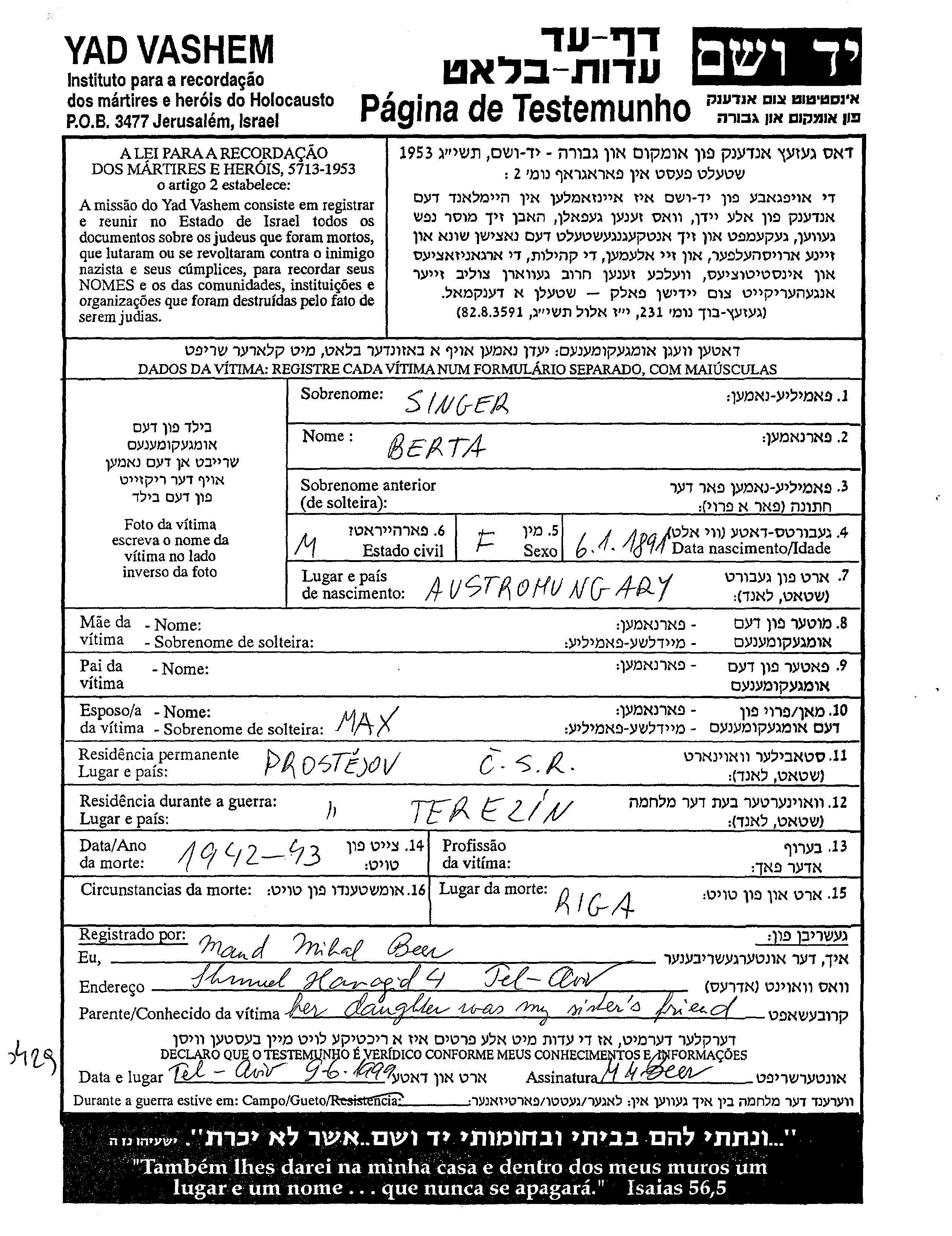 Зингер Берта 1891 Простеёв, Чехословакия Лист свидетельских показаний
