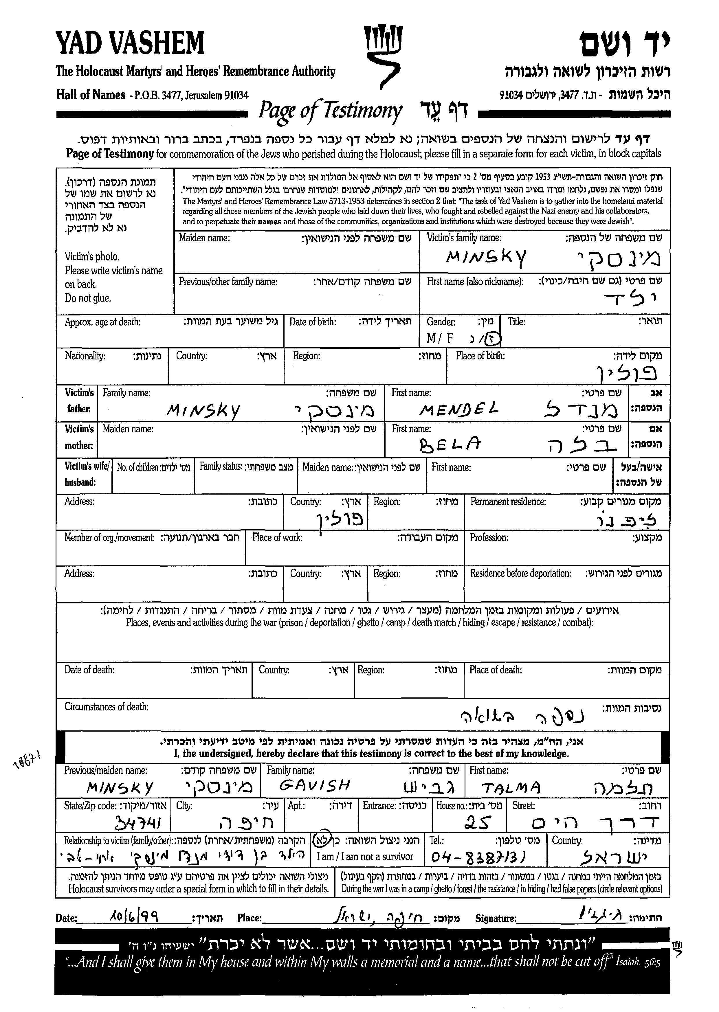 Имя неизвестно Мински, место рождения: Польша. Отец: Мендель, mать:Бела. Место жительства до войны: Липно, Польша.