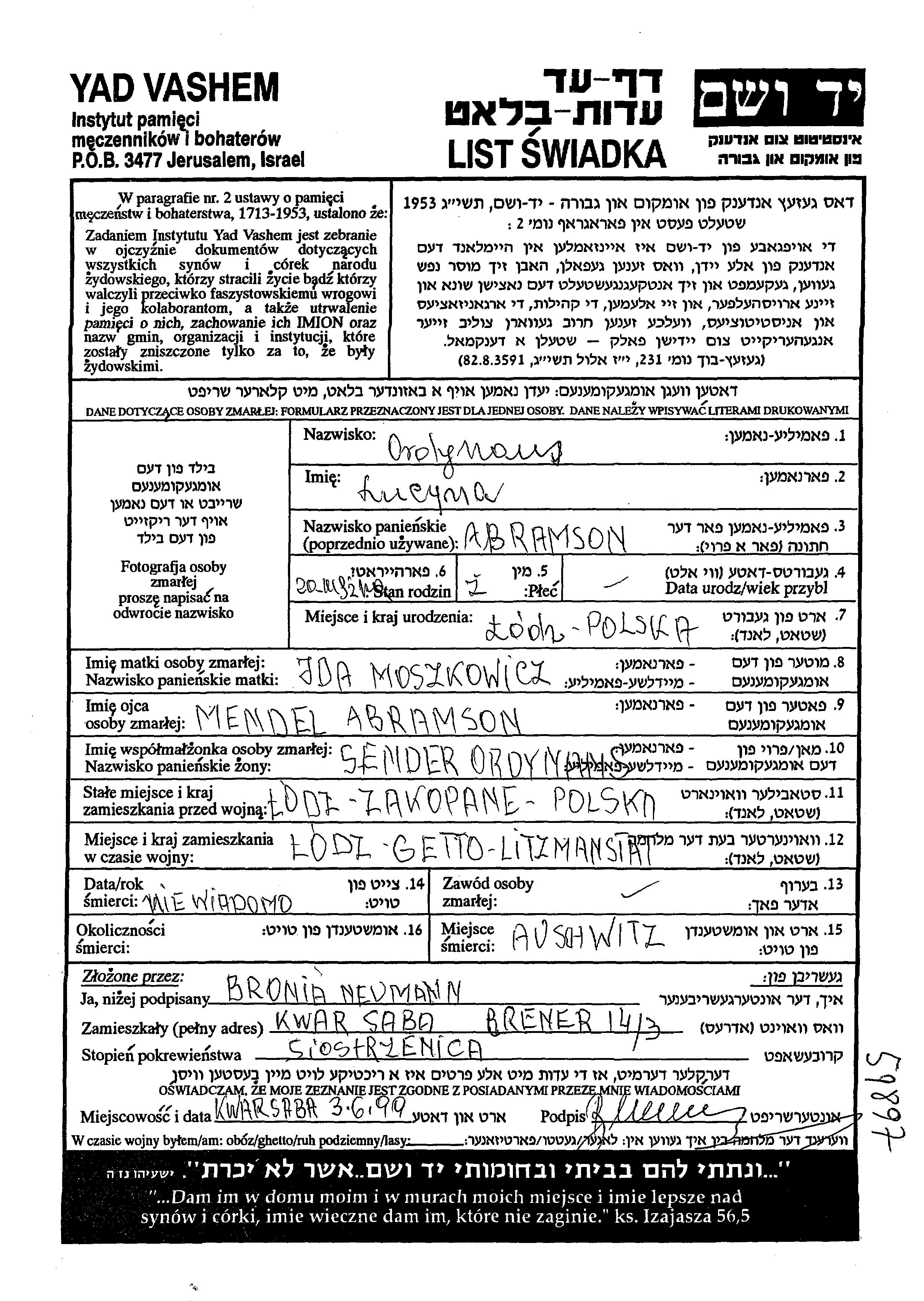 Ордынаус Луцина Лодзь, Польша Лист свидетельских показаний