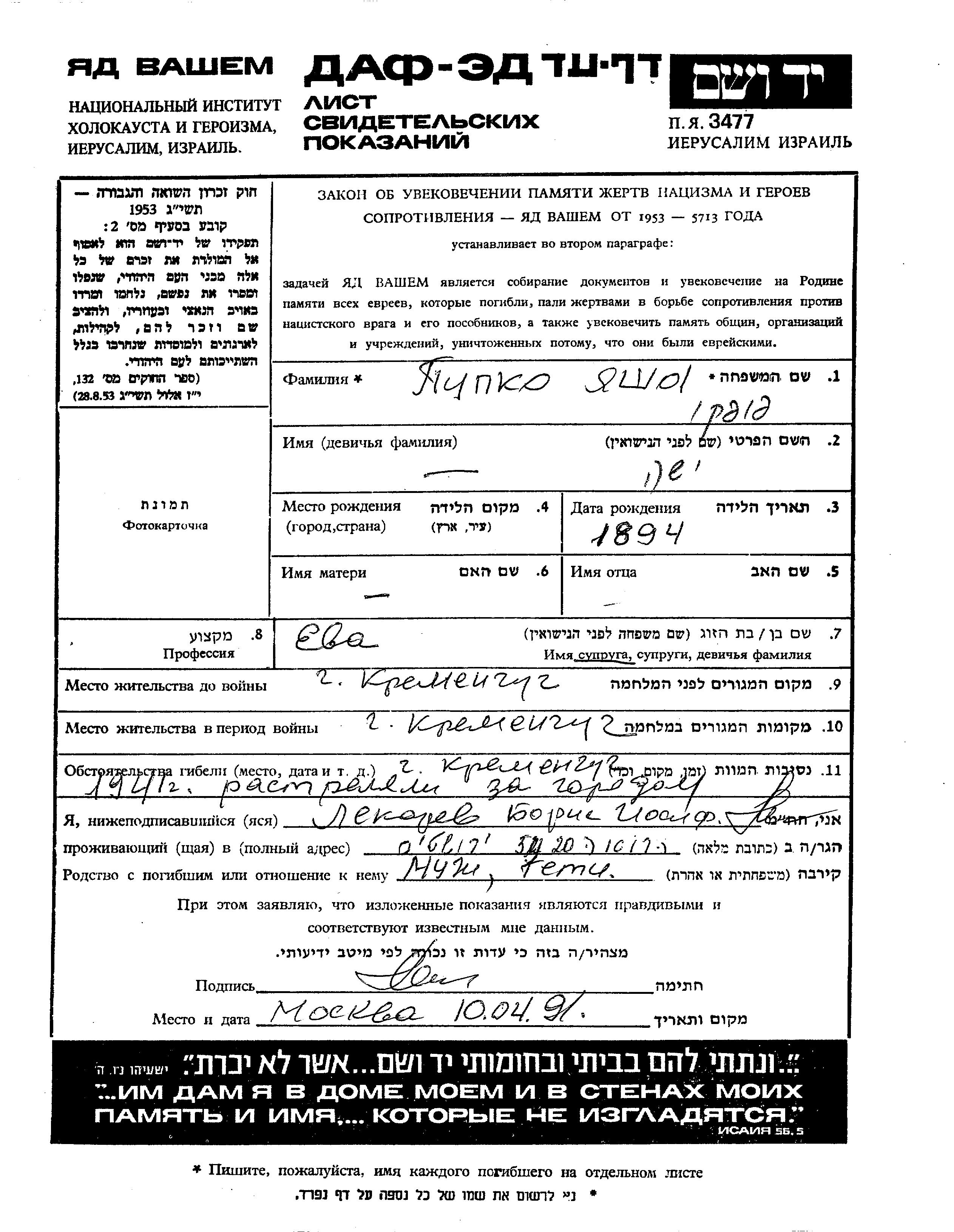 Пупко Попко Яша 1894 Кременчуг, Украина (СССР) Лист свидетельских показаний